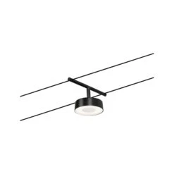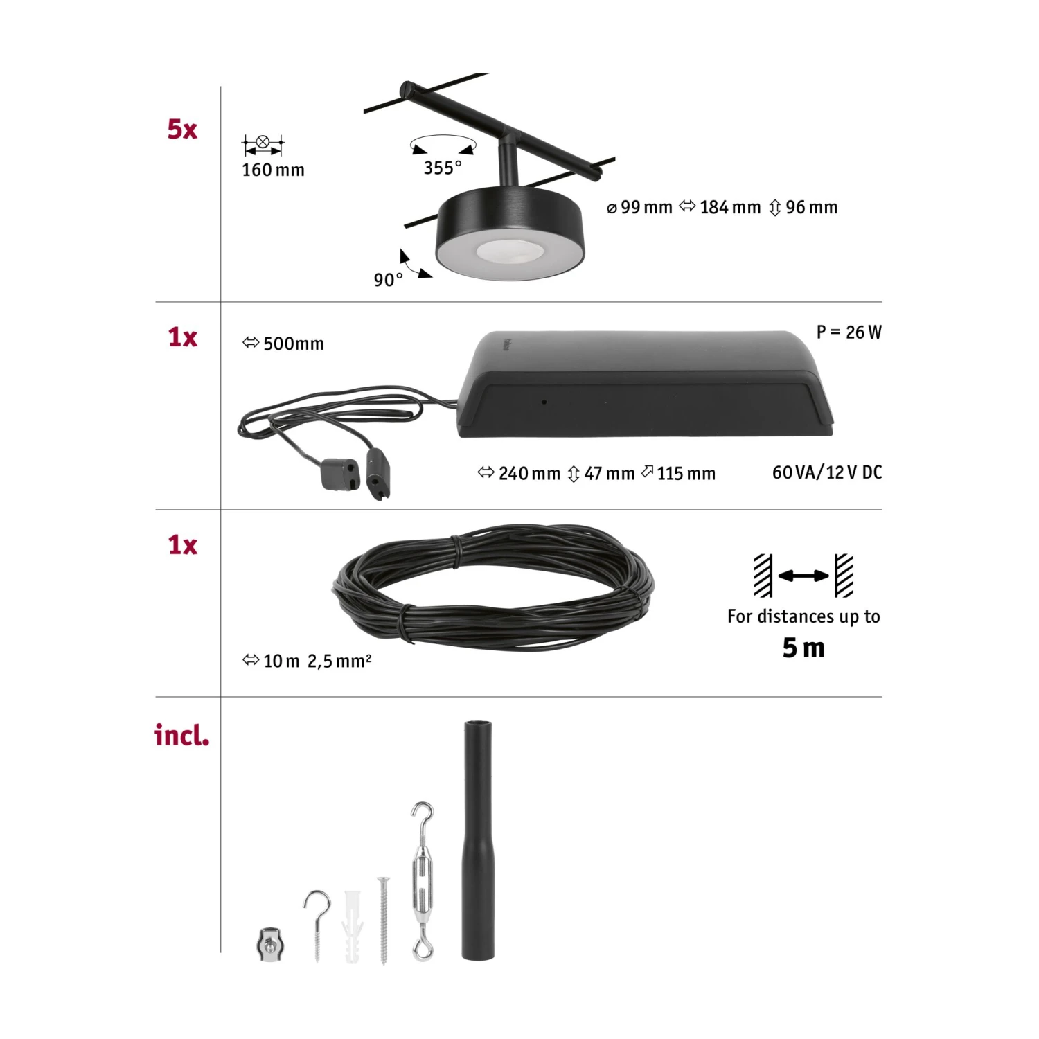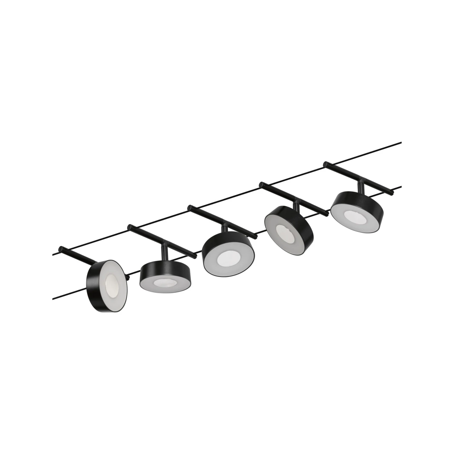 Die Serie Circle in Schwarz matt mit 5 LED-Spots kann sowohl an der Wand als auch an der Decke montiert werden und bietet dadurch grenzenlose Gestaltungsmöglichkeiten. Egal ob gerade, schräg oder verwinkelt – Seilsysteme passen in jeden Raum und sind die Problemlöser für schwierige Installationsbedingungen. Das Basisset lässt sich individuell durch Einzelspots, Umlenker und weiteres Zubehör ergänzen. Das Seil mit einer Länge vom 10 m, kann in der Mitte geteilt werden, sodass das System auf max. 5 m gespannt werden kann. Mit diesem System lässt sich eine optimale Lichtverteilung realisieren, bei steigendem Lichtbedarf lässt es sich problemlos erweitern. Für die Verteilung der Leuchten im gesamten Raum wird nur ein Stromauslass benötigt. Systeme mit der Technik 12V DC (Gleichspannung) lassen sich nicht über einen Wand-Einbaudimmer dimmen.