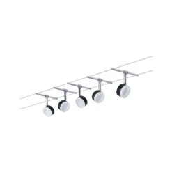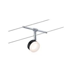 Die Serie ClearLED in Schwarz/Chrom mit einem blauen Dekoring, kann sowohl an der Wand als auch an der Decke montiert werden und bietet dadurch grenzenlose Gestaltungsmöglichkeiten. Egal ob gerade, schräg oder verwinkelt – Seilsysteme passen in jeden Raum und sind die Problemlöser für schwierige Installationsbedingungen. Das Basisset lässt sich individuell durch Einzelspots, Umlenker und weiteres Zubehör ergänzen. Das Seil mit einer Länge vom 10 m, kann in der Mitte geteilt werden, sodass das System auf max. 5 m gespannt werden kann. Mit diesem System lässt sich eine optimale Lichtverteilung realisieren, bei steigendem Lichtbedarf lässt es sich problemlos erweitern. Für die Verteilung der Leuchten im gesamten Raum wird nur ein Stromauslass benötigt. Systeme mit der Technik 12V DC (Gleichspannung) lassen sich nicht über einen Wand-Einbaudimmer dimmen.