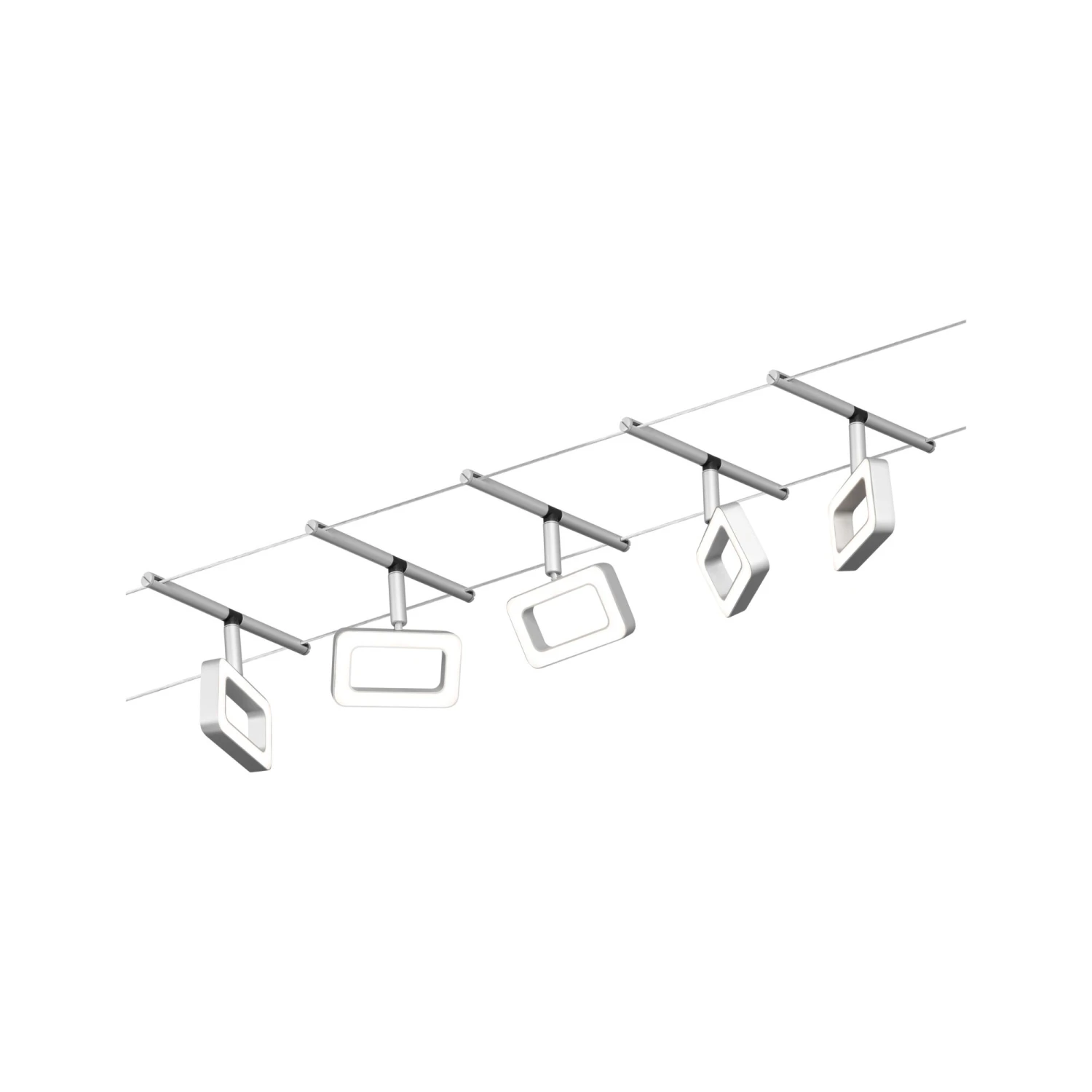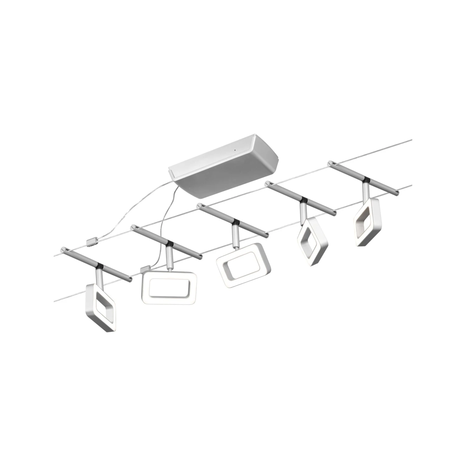 Die Serie Frame in Chrom matt/Chrom mit 5 LED-Spots kann sowohl an der Wand als auch an der Decke montiert werden und bietet dadurch grenzenlose Gestaltungsmöglichkeiten. Egal ob gerade, schräg oder verwinkelt – Seilsysteme passen in jeden Raum und sind die Problemlöser für schwierige Installationsbedingungen. Das Basisset lässt sich individuell durch Einzelspots, Umlenker und weiteres Zubehör ergänzen. Das Seil mit einer Länge vom 10 m, kann in der Mitte geteilt werden, sodass das System auf max. 5 m gespannt werden kann. Mit diesem System lässt sich eine optimale Lichtverteilung realisieren, bei steigendem Lichtbedarf lässt es sich problemlos erweitern. Für die Verteilung der Leuchten im gesamten Raum wird nur ein Stromauslass benötigt. Systeme mit der Technik 12V DC (Gleichspannung) lassen sich nicht über einen Wand-Einbaudimmer dimmen.