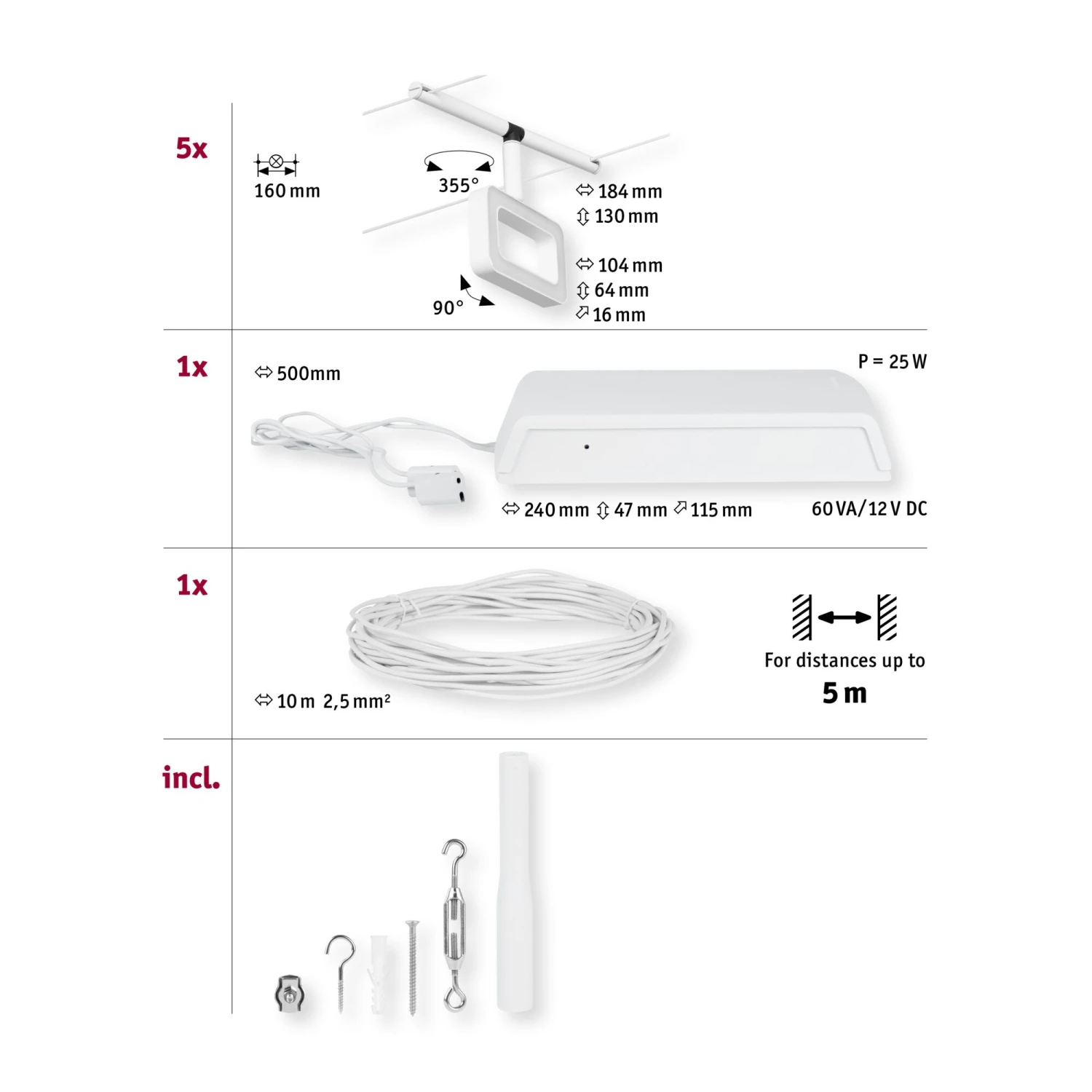 Die Serie Frame in Weiß matt/Chrom mit 5 LED-Spots kann sowohl an der Wand als auch an der Decke montiert werden und bietet dadurch grenzenlose Gestaltungsmöglichkeiten. Egal ob gerade, schräg oder verwinkelt – Seilsysteme passen in jeden Raum und sind die Problemlöser für schwierige Installationsbedingungen. Das Basisset lässt sich individuell durch Einzelspots, Umlenker und weiteres Zubehör ergänzen. Das Seil mit einer Länge vom 10 m, kann in der Mitte geteilt werden, sodass das System auf max. 5 m gespannt werden kann. Mit diesem System lässt sich eine optimale Lichtverteilung realisieren, bei steigendem Lichtbedarf lässt es sich problemlos erweitern. Für die Verteilung der Leuchten im gesamten Raum wird nur ein Stromauslass benötigt. Systeme mit der Technik 12V DC (Gleichspannung) lassen sich nicht über einen Wand-Einbaudimmer dimmen.