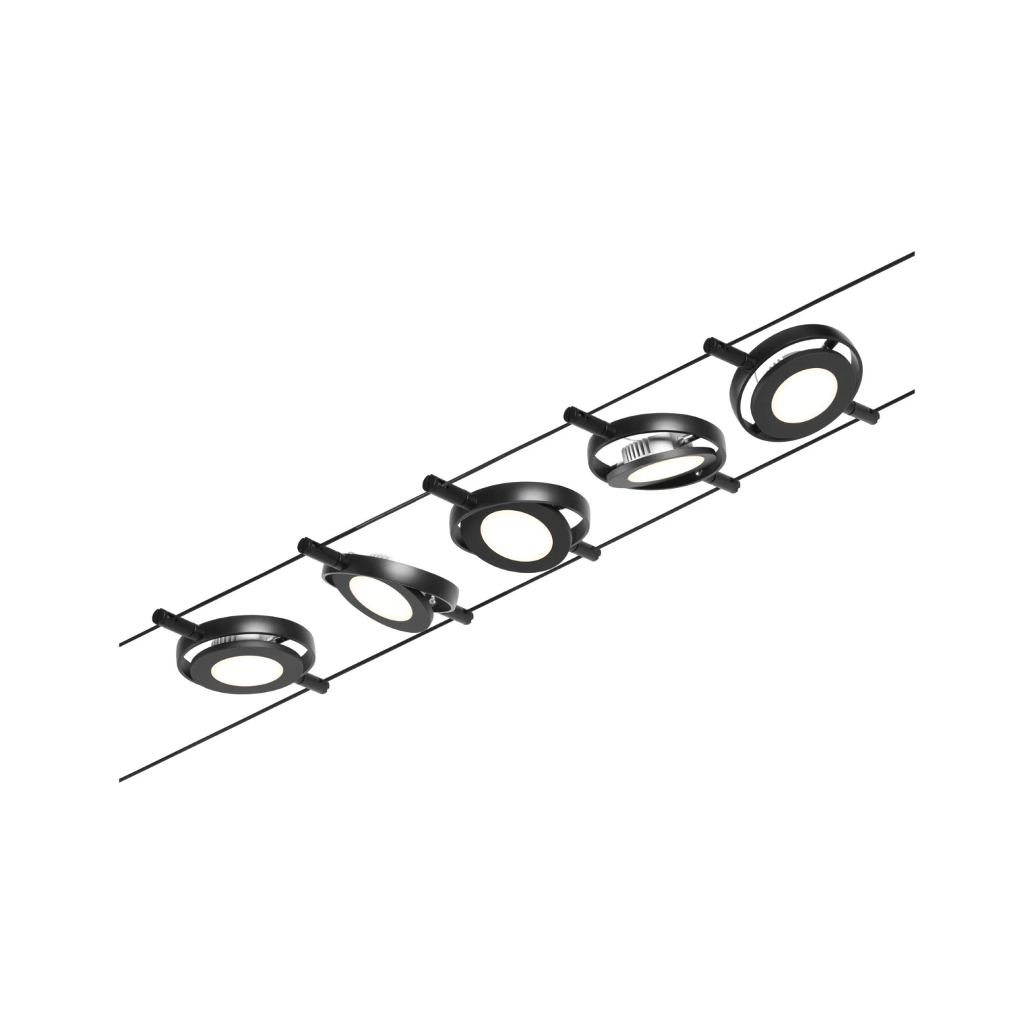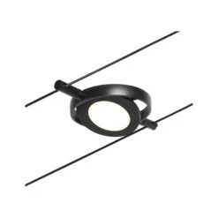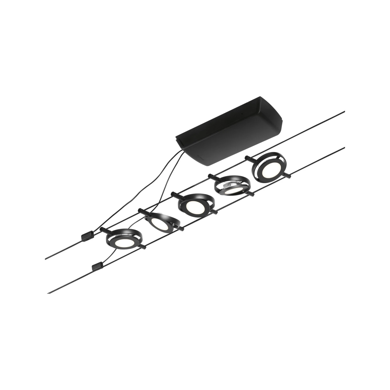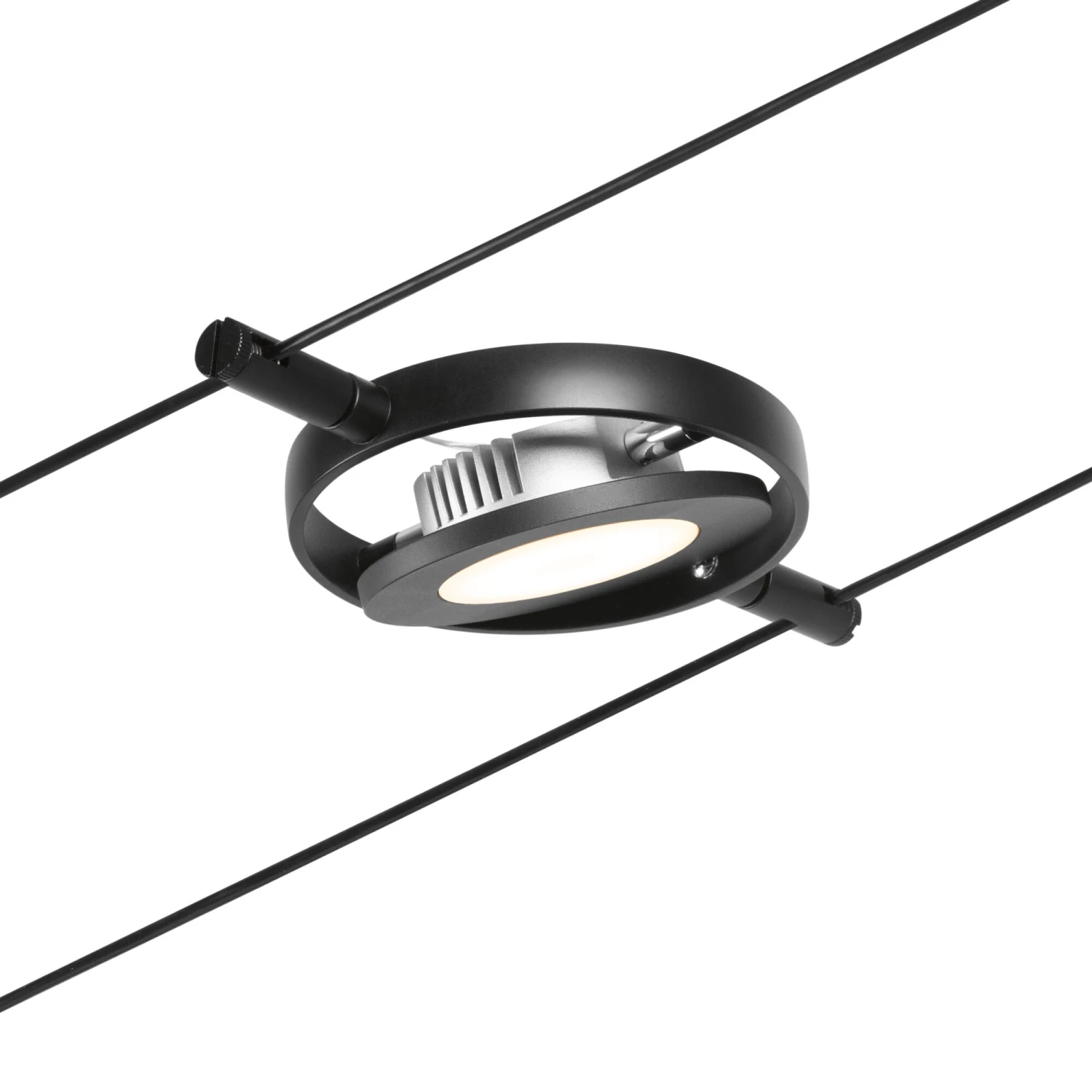 Die Serie RoundMac in Schwarz matt/Chrom kann sowohl an der Wand als auch an der Decke montiert werden und bietet dadurch grenzenlose Gestaltungsmöglichkeiten. Egal ob gerade, schräg oder verwinkelt – Seilsysteme passen in jeden Raum und sind die Problemlöser für schwierige Installationsbedingungen. Das Basisset lässt sich individuell durch Einzelspots, Umlenker und weiteres Zubehör ergänzen. Das Seil mit einer Länge vom 10 m, kann in der Mitte geteilt werden, sodass das System auf max. 5 m gespannt werden kann. Mit diesem System lässt sich eine optimale Lichtverteilung realisieren, bei steigendem Lichtbedarf lässt es sich problemlos erweitern. Für die Verteilung der Leuchten im gesamten Raum wird nur ein Stromauslass benötigt. Systeme mit der Technik 12V DC (Gleichspannung) lassen sich nicht über einen Wand-Einbaudimmer dimmen.