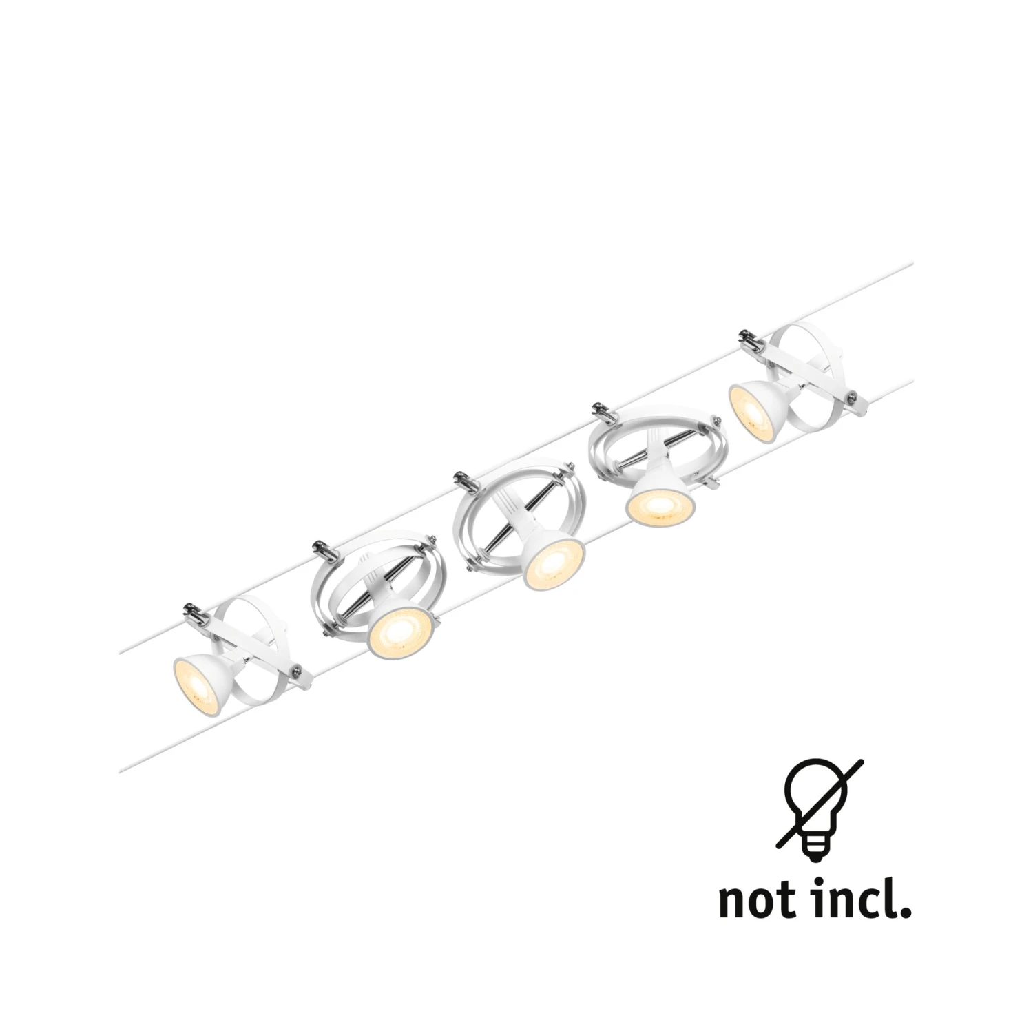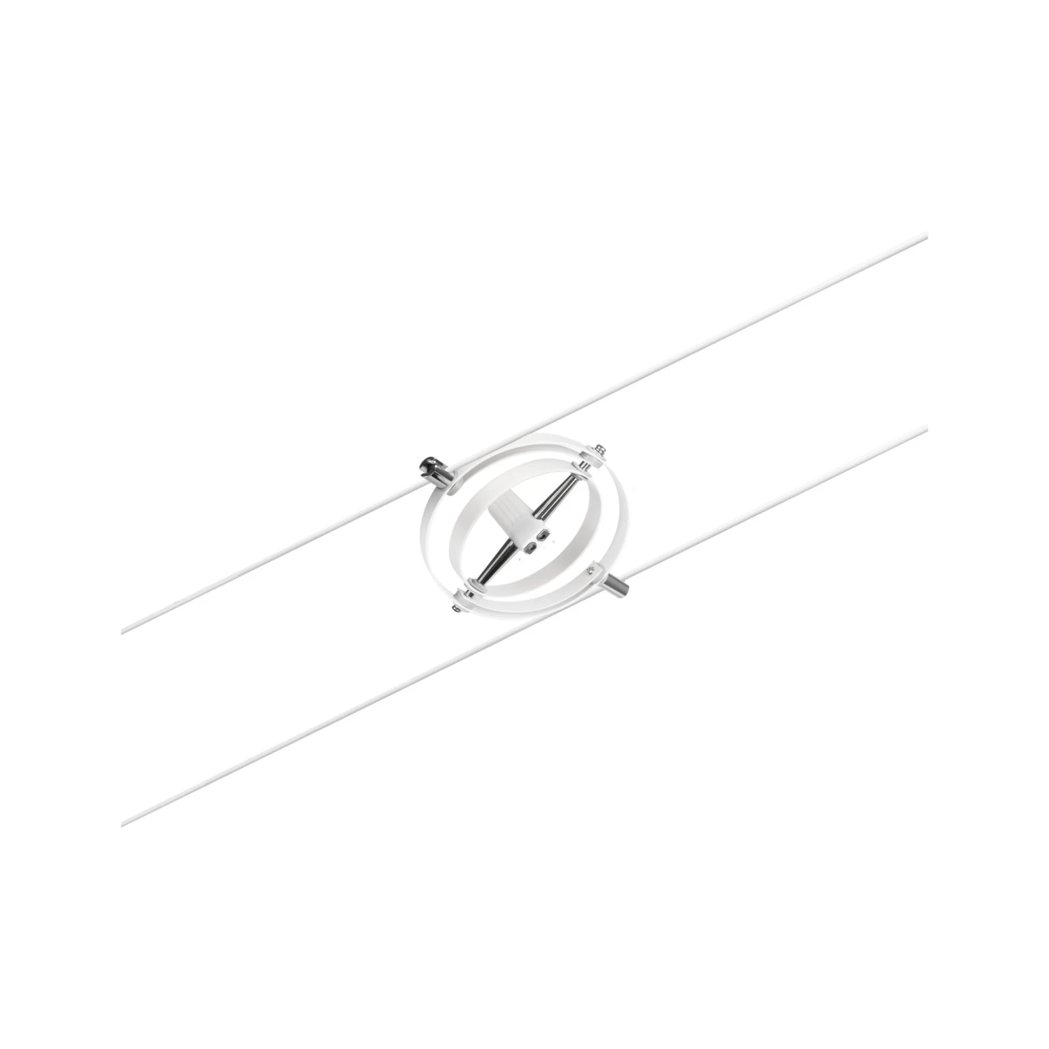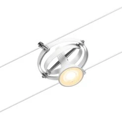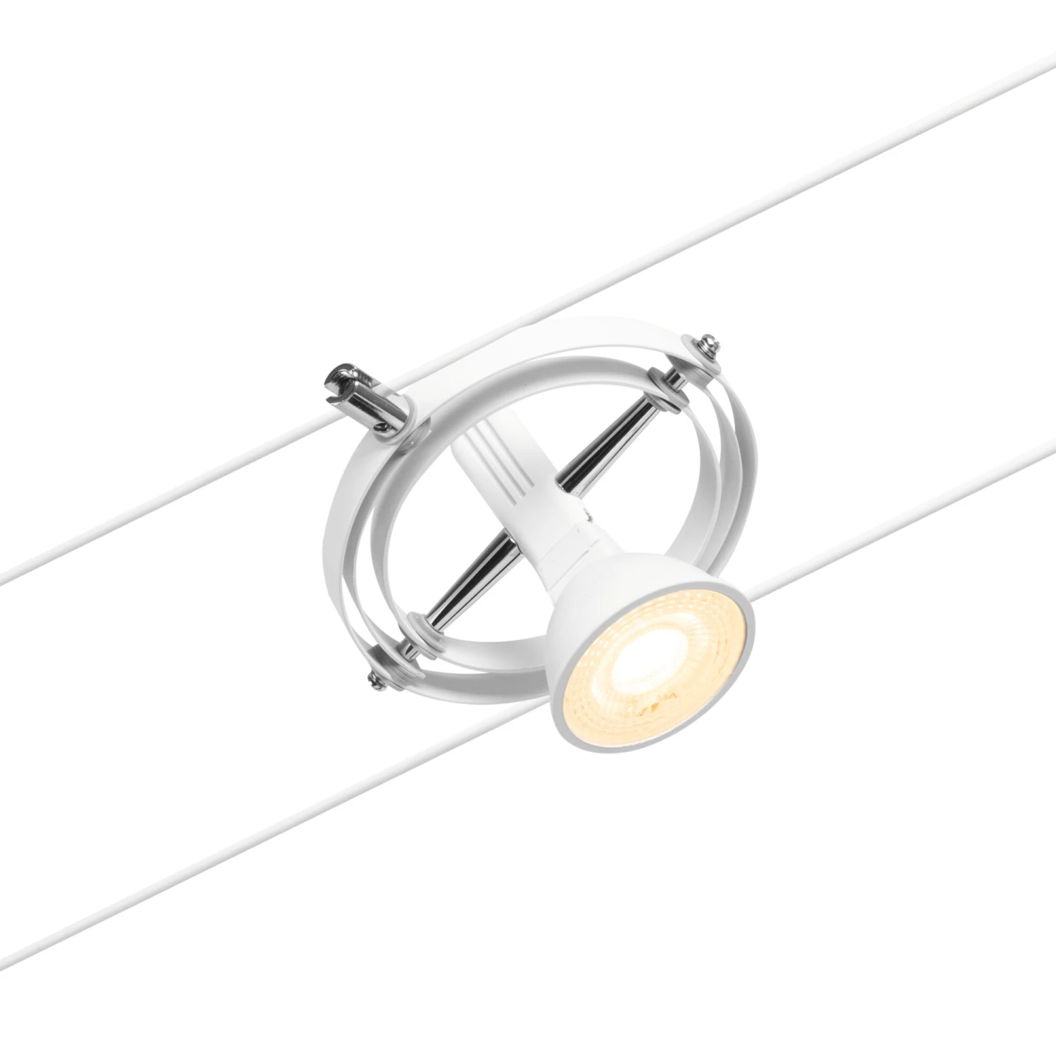 Die Serie Cardan in Weiß matt/Chrom kann sowohl an der Wand als auch an der Decke montiert werden und bietet dadurch grenzenlose Gestaltungsmöglichkeiten. Egal ob gerade, schräg oder verwinkelt – Seilsysteme passen in jeden Raum und sind die Problemlöser für schwierige Installationsbedingungen. Das Basisset lässt sich individuell durch Einzelspots, Umlenker und weiteres Zubehör ergänzen. Das Seil mit einer Länge vom 10 m, kann in der Mitte geteilt werden, sodass das System auf max. 5 m gespannt werden kann. Mit diesem System lässt sich eine optimale Lichtverteilung realisieren, bei steigendem Lichtbedarf lässt es sich problemlos erweitern. Für die Verteilung der Leuchten im gesamten Raum wird nur ein Stromauslass benötigt. Systeme mit der Technik 12V DC (Gleichspannung) lassen sich nicht über einen Wand-Einbaudimmer dimmen.