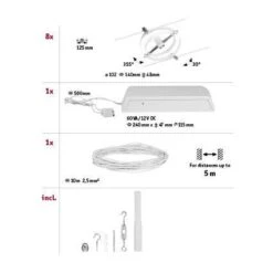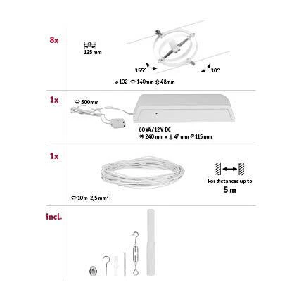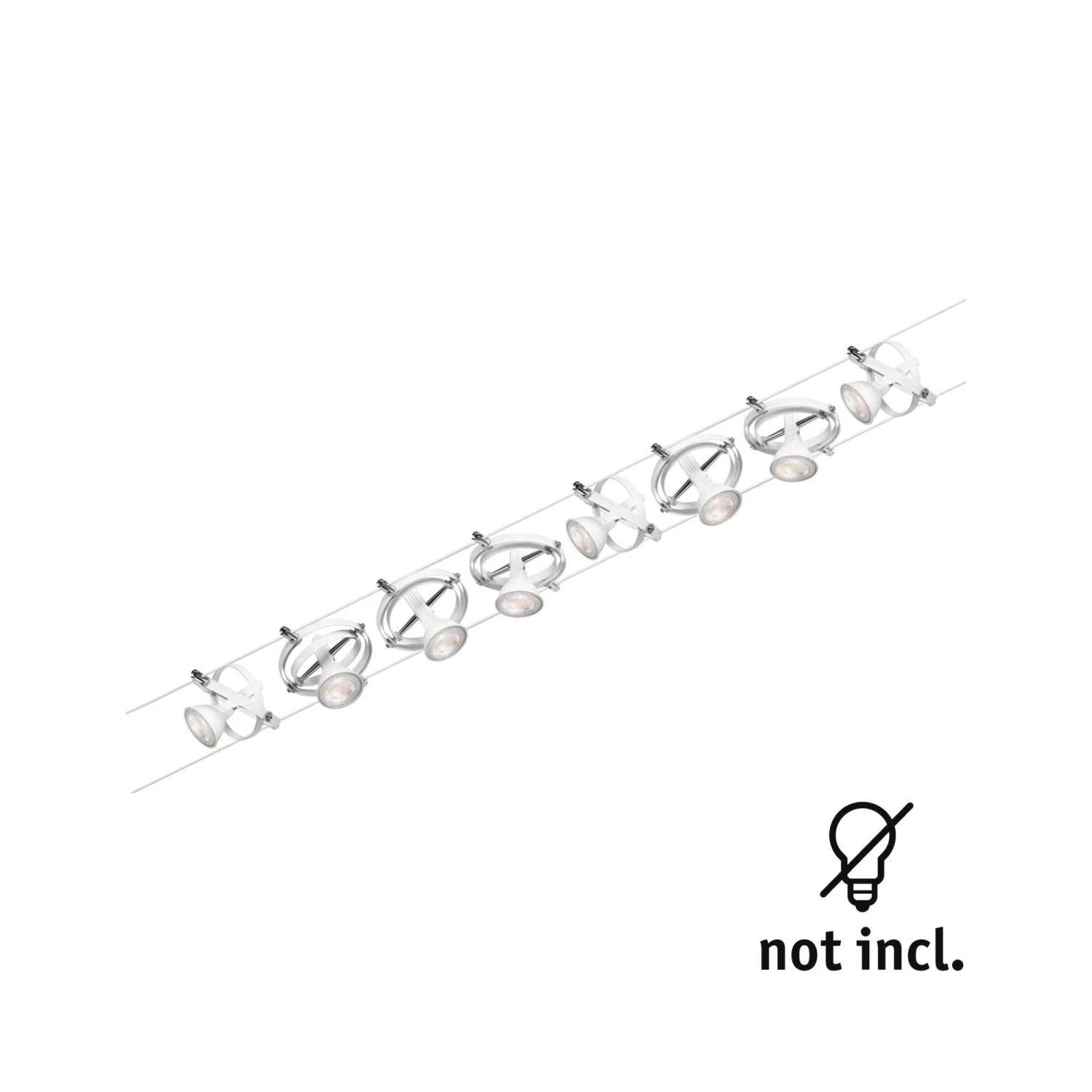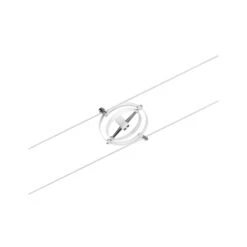 Die Serie Cardan in Weiß matt mit 8 Spots ohne Leuchtmittel kann sowohl an der Wand als auch an der Decke montiert werden und bietet dadurch grenzenlose Gestaltungsmöglichkeiten. Egal ob gerade, schräg oder verwinkelt – Seilsysteme passen in jeden Raum und sind die Problemlöser für schwierige Installationsbedingungen. Das Basisset lässt sich individuell durch Einzelspots, Umlenker und weiteres Zubehör ergänzen. Das Seil mit einer Länge vom 10 m, kann in der Mitte geteilt werden, sodass das System auf max. 5 m gespannt werden kann. Mit diesem System lässt sich eine optimale Lichtverteilung realisieren, bei steigendem Lichtbedarf lässt es sich problemlos erweitern. Für die Verteilung der Leuchten im gesamten Raum wird nur ein Stromauslass benötigt. Systeme mit der Technik 12V DC (Gleichspannung) lassen sich nicht über einen Wand-Einbaudimmer dimmen.