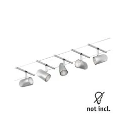 Die Serie Cup in Chrom matt/Chrom mit 5 Spots ohne Leuchtmittel kann sowohl an der Wand als auch an der Decke montiert werden und bietet dadurch grenzenlose Gestaltungsmöglichkeiten. Egal ob gerade, schräg oder verwinkelt – Seilsysteme passen in jeden Raum und sind die Problemlöser für schwierige Installationsbedingungen. Das Basisset lässt sich individuell durch Einzelspots, Umlenker und weiteres Zubehör ergänzen. Das Seil mit einer Länge vom 10 m, kann in der Mitte geteilt werden, sodass das System auf max. 5 m gespannt werden kann. Mit diesem System lässt sich eine optimale Lichtverteilung realisieren, bei steigendem Lichtbedarf lässt es sich problemlos erweitern. Für die Verteilung der Leuchten im gesamten Raum wird nur ein Stromauslass benötigt. Systeme mit der Technik 12V DC (Gleichspannung) lassen sich nicht über einen Wand-Einbaudimmer dimmen.