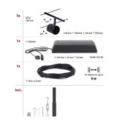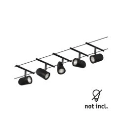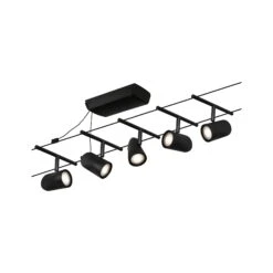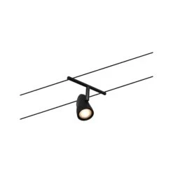 Die Serie Cup in Schwarz matt/Chrom mit 5 Spots ohne Leuchtmittel kann sowohl an der Wand als auch an der Decke montiert werden und bietet dadurch grenzenlose Gestaltungsmöglichkeiten. Egal ob gerade, schräg oder verwinkelt – Seilsysteme passen in jeden Raum und sind die Problemlöser für schwierige Installationsbedingungen. Das Basisset lässt sich individuell durch Einzelspots, Umlenker und weiteres Zubehör ergänzen. Das Seil mit einer Länge vom 10 m, kann in der Mitte geteilt werden, sodass das System auf max. 5 m gespannt werden kann. Mit diesem System lässt sich eine optimale Lichtverteilung realisieren, bei steigendem Lichtbedarf lässt es sich problemlos erweitern. Für die Verteilung der Leuchten im gesamten Raum wird nur ein Stromauslass benötigt. Systeme mit der Technik 12V DC (Gleichspannung) lassen sich nicht über einen Wand-Einbaudimmer dimmen.