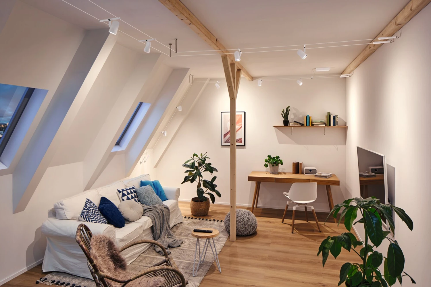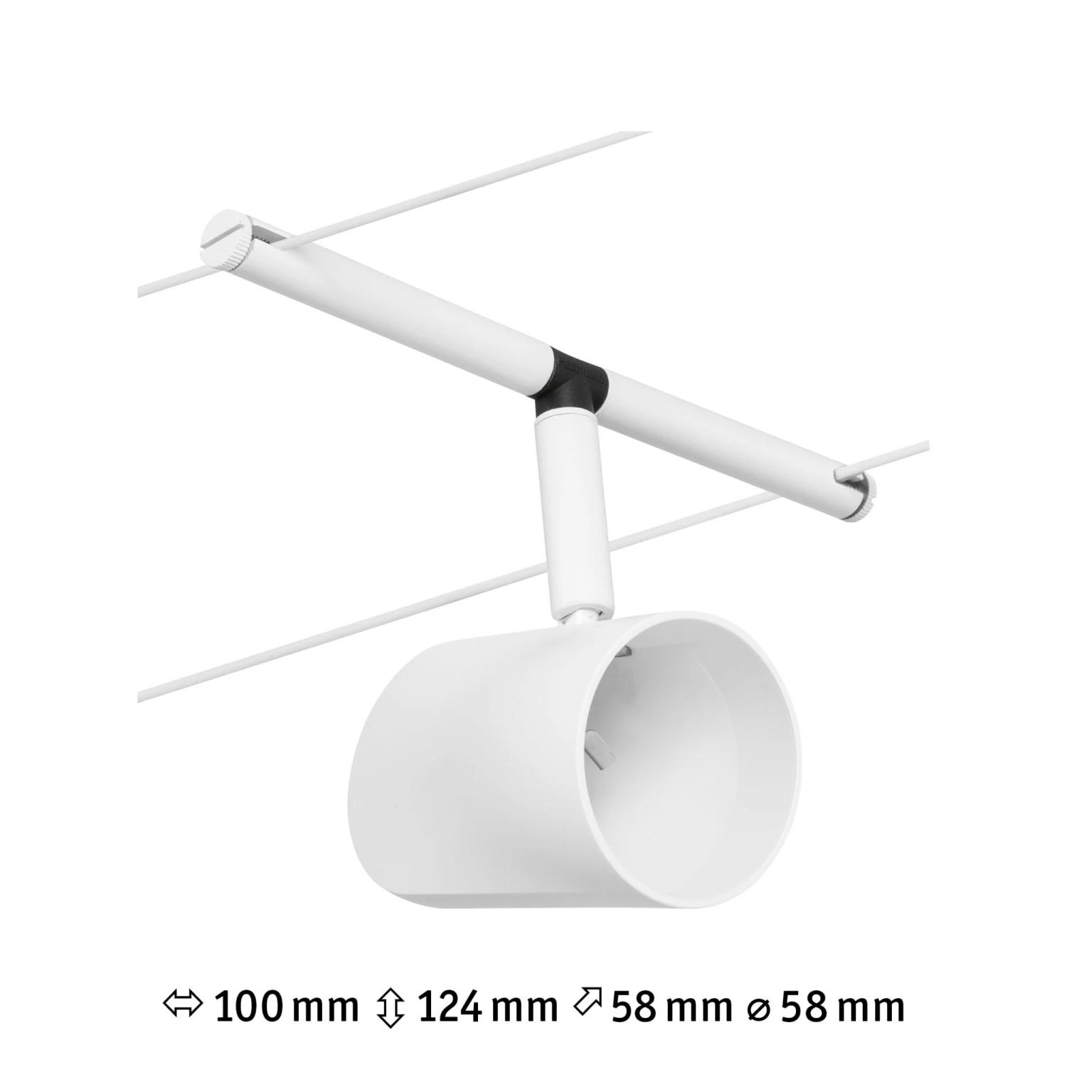 Der Einzelspot Cup in Weiß matt, Chrom eignet sich besonders zur Ergänzung eines bestehenden Seilsystems. Das System kann sowohl an der Wand als auch an der Decke montiert werden und bietet dadurch grenzenlose Gestaltungsmöglichkeiten. Egal ob gerade, schräg oder verwinkelt – Seilsysteme passen in jeden Raum und sind die Problemlöser für schwierige Installationsbedingungen. Mit diesem System lässt sich eine optimale Lichtverteilung realisieren, bei steigendem Lichtbedarf lässt es sich problemlos erweitern. Für die Verteilung der Leuchten im gesamten Raum wird nur ein Stromauslass benötigt. Systeme mit der Technik 12V DC (Gleichspannung) lassen sich nicht über einen Wand-Einbaudimmer dimmen.