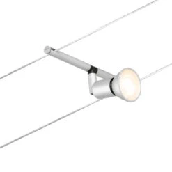 Die Serie Salt in Chrom matt kann sowohl an der Wand als auch an der Decke montiert werden und bietet dadurch grenzenlose Gestaltungsmöglichkeiten. Egal ob gerade, schräg oder verwinkelt – Seilsysteme passen in jeden Raum und sind die Problemlöser für schwierige Installationsbedingungen. Das Basisset lässt sich individuell durch Einzelspots, Umlenker und weiteres Zubehör ergänzen. Das Seil mit einer Länge vom 10 m, kann in der Mitte geteilt werden, sodass das System auf max. 5 m gespannt werden kann. Mit diesem System lässt sich eine optimale Lichtverteilung realisieren, bei steigendem Lichtbedarf lässt es sich problemlos erweitern. Für die Verteilung der Leuchten im gesamten Raum wird nur ein Stromauslass benötigt. Systeme mit der Technik 12V DC (Gleichspannung) lassen sich nicht über einen Wand-Einbaudimmer dimmen.