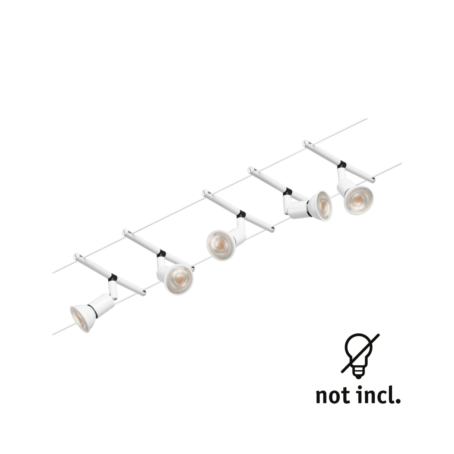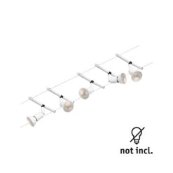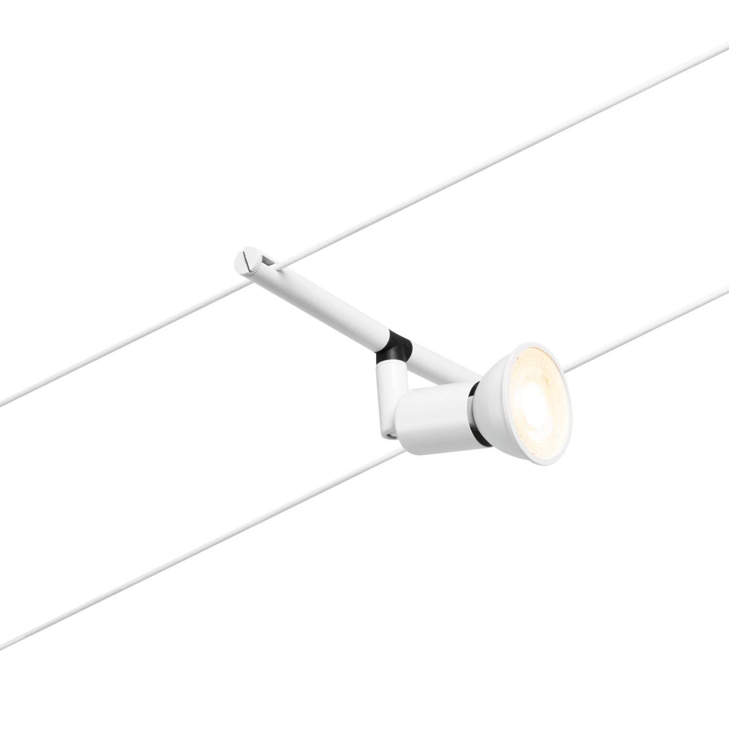 Die Serie Salt in Weiß matt/Chrom kann sowohl an der Wand als auch an der Decke montiert werden und bietet dadurch grenzenlose Gestaltungsmöglichkeiten. Egal ob gerade, schräg oder verwinkelt – Seilsysteme passen in jeden Raum und sind die Problemlöser für schwierige Installationsbedingungen. Das Basisset lässt sich individuell durch Einzelspots, Umlenker und weiteres Zubehör ergänzen. Das Seil mit einer Länge vom 10 m, kann in der Mitte geteilt werden, sodass das System auf max. 5 m gespannt werden kann. Mit diesem System lässt sich eine optimale Lichtverteilung realisieren, bei steigendem Lichtbedarf lässt es sich problemlos erweitern. Für die Verteilung der Leuchten im gesamten Raum wird nur ein Stromauslass benötigt. Systeme mit der Technik 12V DC (Gleichspannung) lassen sich nicht über einen Wand-Einbaudimmer dimmen.