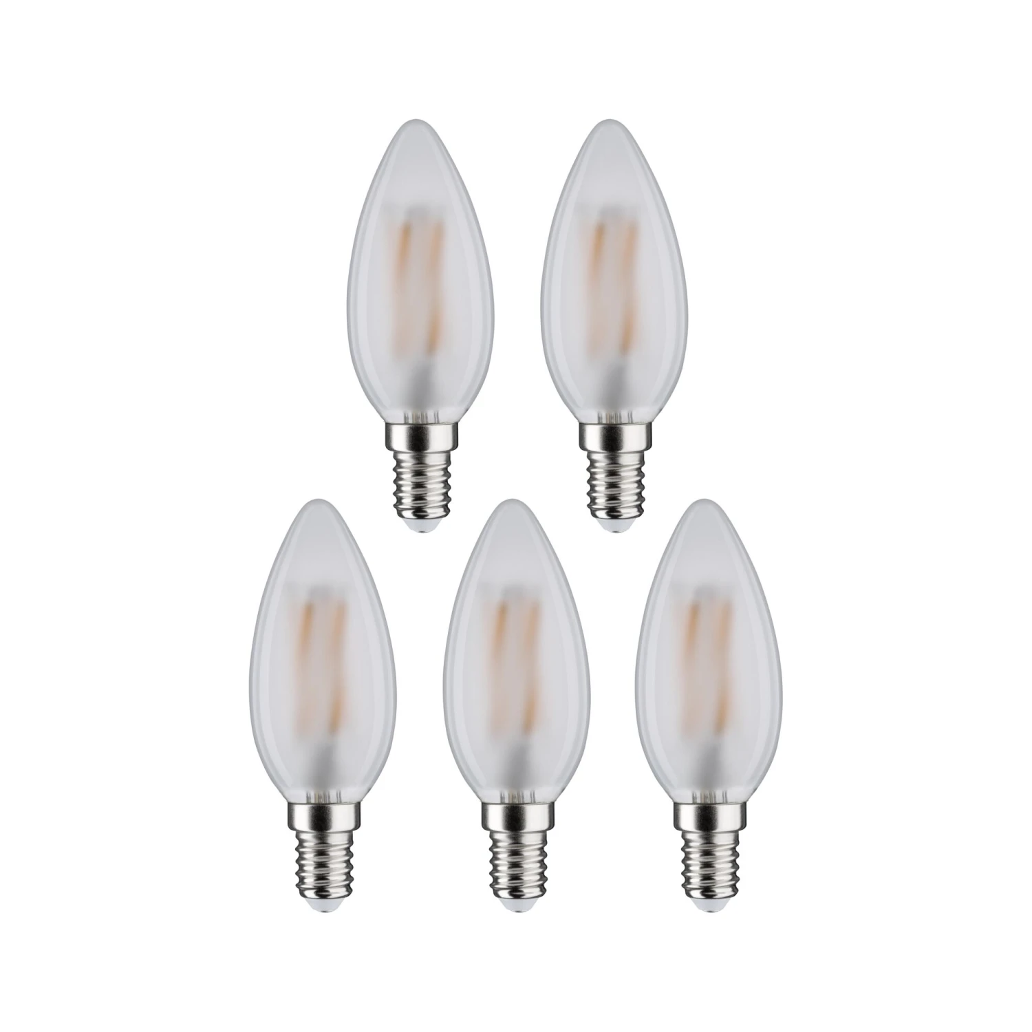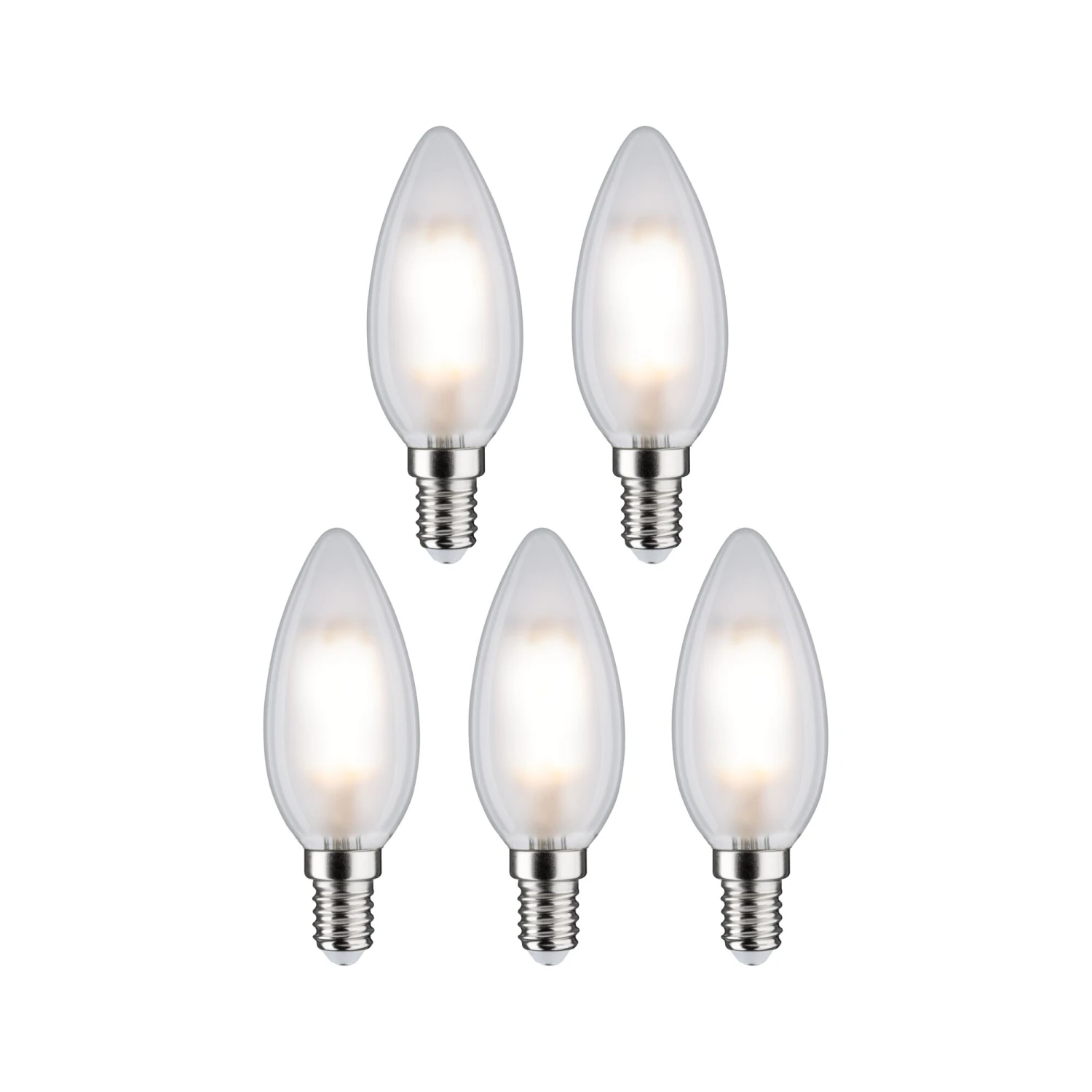Die matten Filament Kerzenlampen (5er Pack) mit 2700K, einer Leistung von 5×4,8W und 5x470lm schaffen ein warmweißes Licht. Die Lampen passen in jede handelsübliche E14 Fassung. Kerzenlampen eignen sich durch ihre schmale Bauform besonders für den Einsatz in Lüstern, Wand- und Deckenleuchten.
