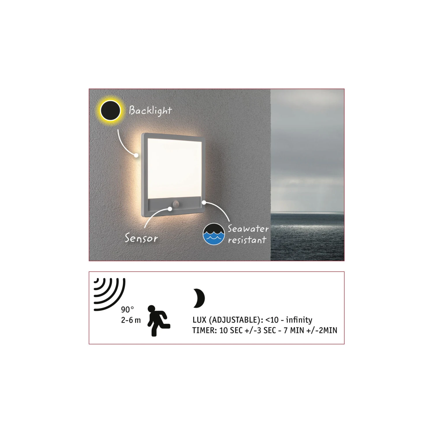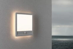 Außenleuchten in Küstennähe unterliegen härteren Umwelteinflüssen als Außenleuchten im Landesinneren. Der Salzgehalt der Luft greift hier Metalle und Kunststoffe stärker an. Gefertigt aus hochwertigem Kunststoff korrodiert das Außenpanel Lamina in den Abmessungen 250x47mm nicht in der Nähe des Meeres. Sowohl an der Wand als auch an der Decke verbreitet das eckige Panel mit dem weißen Rahmen und der weißen Innenfläche flächiges warmweißes Licht. Das zusätzliche Hintergrundlicht schafft eine angenehme Atmosphäre und setzt die Wand/Decke besonders in Szene. Der Bewegungsmelder sorgt dafür, dass das Licht bei Dunkelheit automatisch angeht, sobald sich jemand annähert. Die verschiedenen Funktionen des Bewegungsmelders lassen sich über einen Schalter an der Leuchte einstellen.