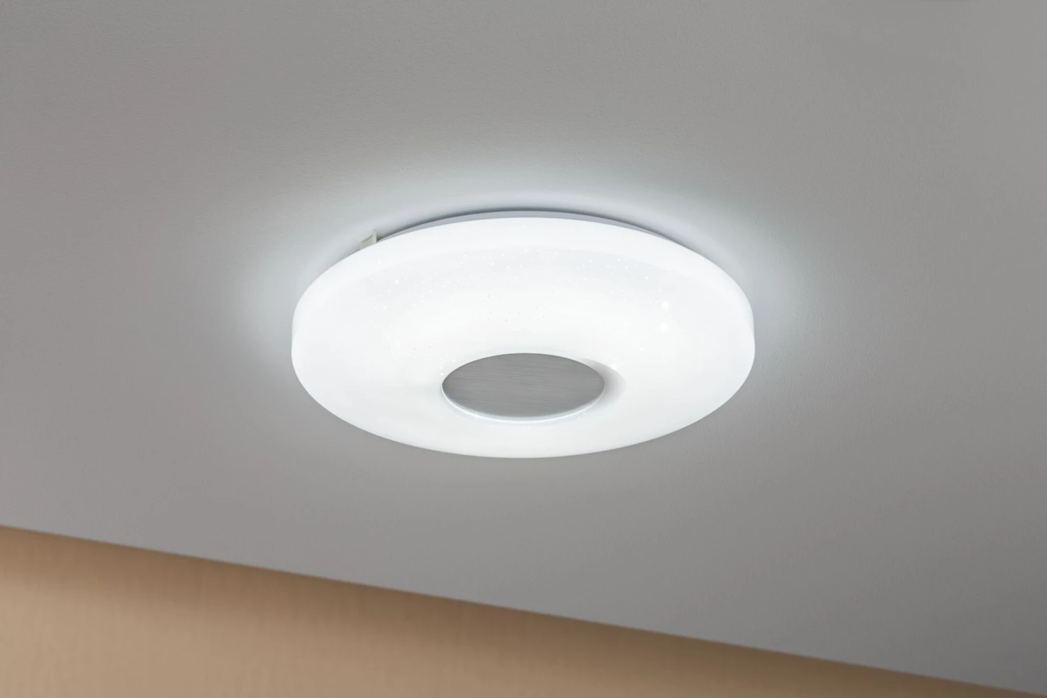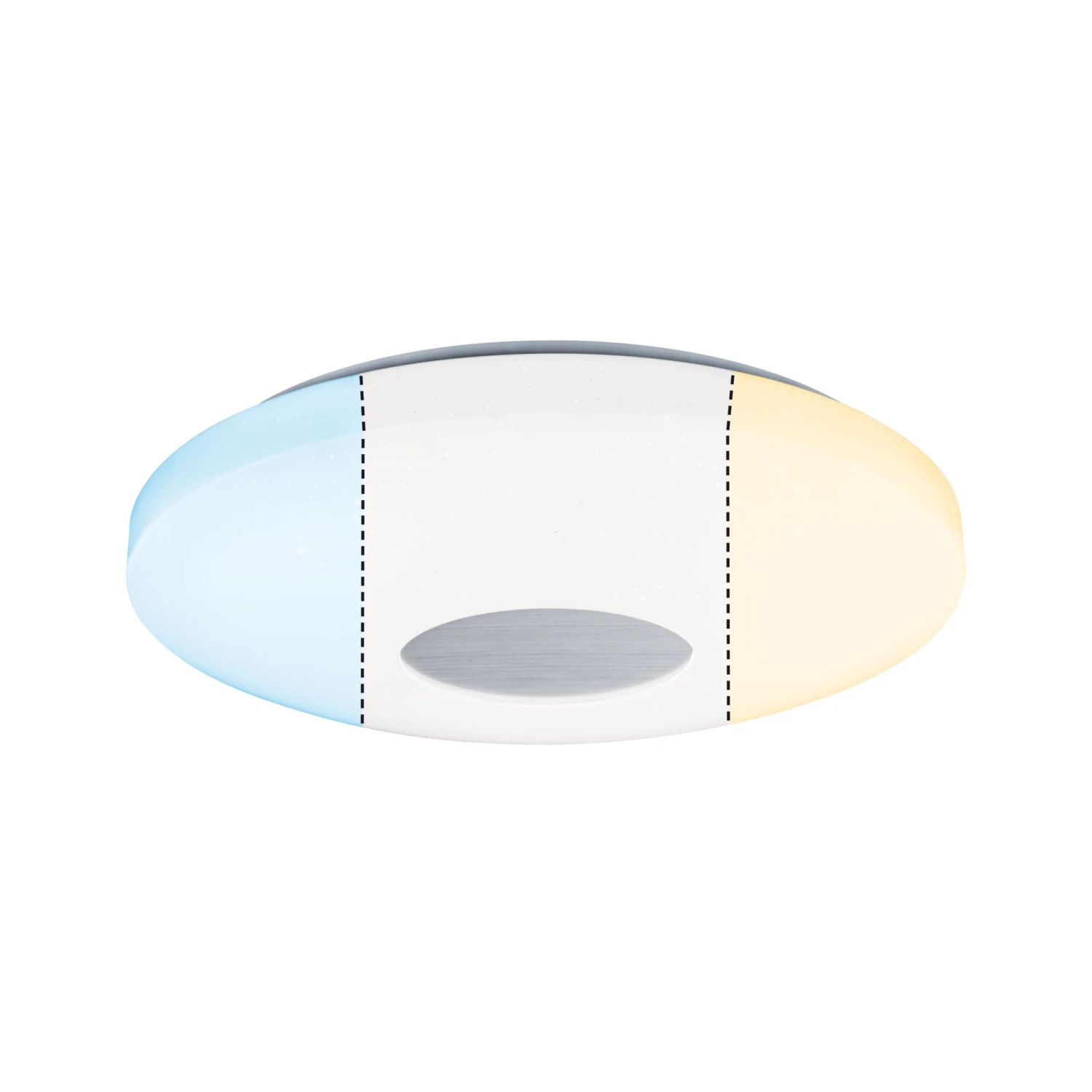 Die runde Deckenleuchte Costella mit einer Leistung von 16 Watt ist mit ihrem Sternenhimmeleffekt ein ganz besonderer Eyecatcher. Durch mehrfaches Drücken des Lichtschalters lassen sich drei verschiedene Weißtöne einstellen: Warmweiß, Neutralweiß und Tageslichtweiß. So passen Sie das Licht jederzeit an Ihre Stimmung und Tätigkeiten im Raum an.