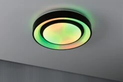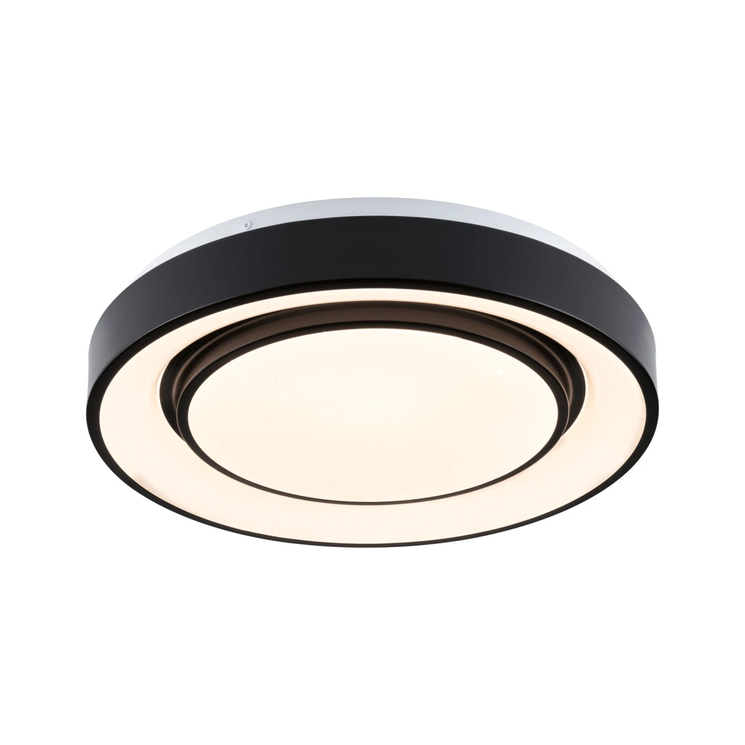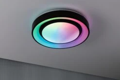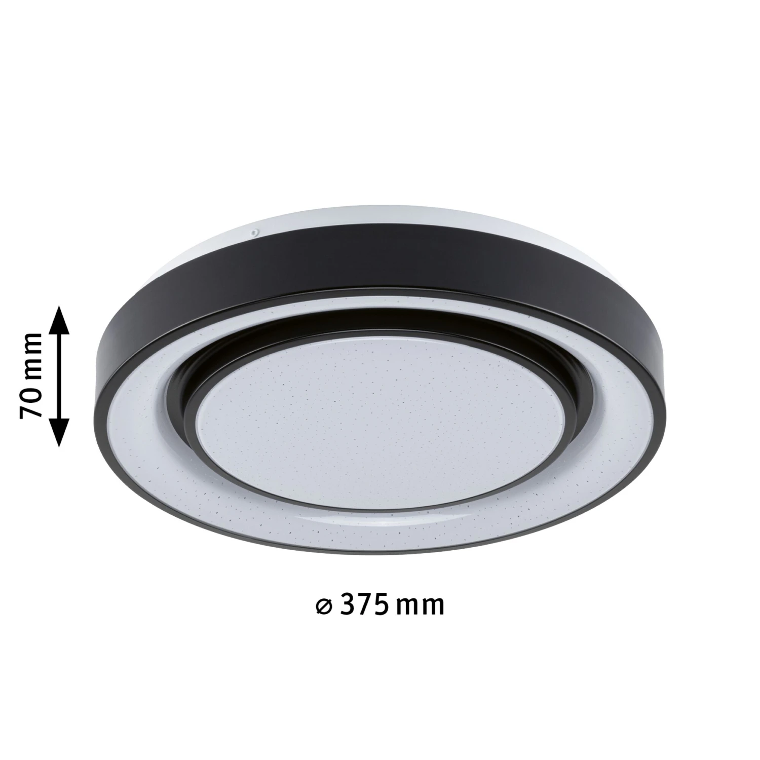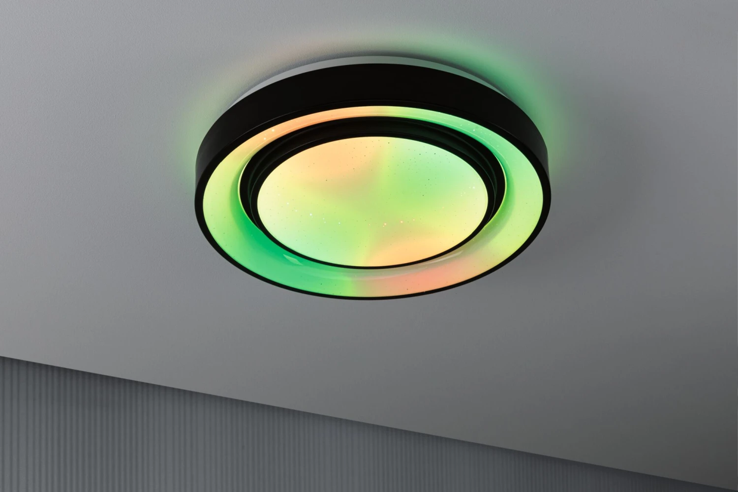Licht aus purer Magie – Die dimmbare Wohnraumleuchte Rainbow mit Regenbogeneffekt in Schwarz/Weiß mit einer Größe von 375mm zaubert magische Lichteffekte an Decke oder Wand. Sie eignet sich als helle Grundbeleuchtung oder als farbenfroher Blickpunkt im Wohnraum. Der Sternenhimmel sorgt für besondere, interessante Lichteffekte. Über die Tunable White Funktion lässt sich die Lichtfarbe nach Bedarf einstellen: von tageslichtweißem Arbeitslicht bis hin zu warmweißer Entspannungsbeleuchtung. Mit der Rainbow-Funktion bringt die Leuchte Farbe in jeden Wohnraum und lässt sich je nach Stimmung individuell einstellen. Ob dynamisches oder statisches RGB Licht, die verschiedenen Lichtstimmungen lassen sich mit Hilfe der mitgelieferten IR Fernbedienung einfach steuern und dimmen. Nachts lässt sich ein Nachtlicht mit 5% Lichtauslass einstellen.