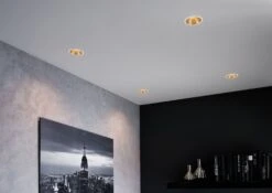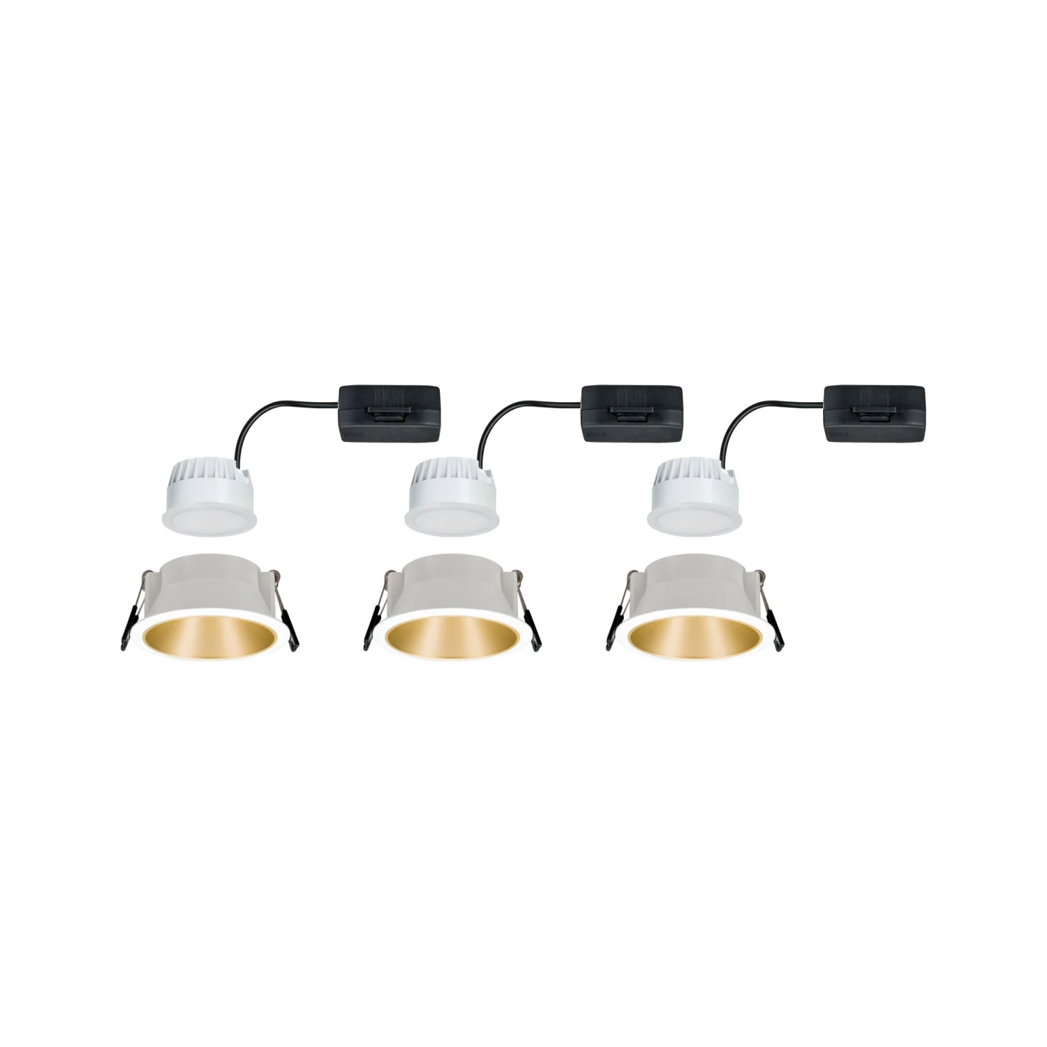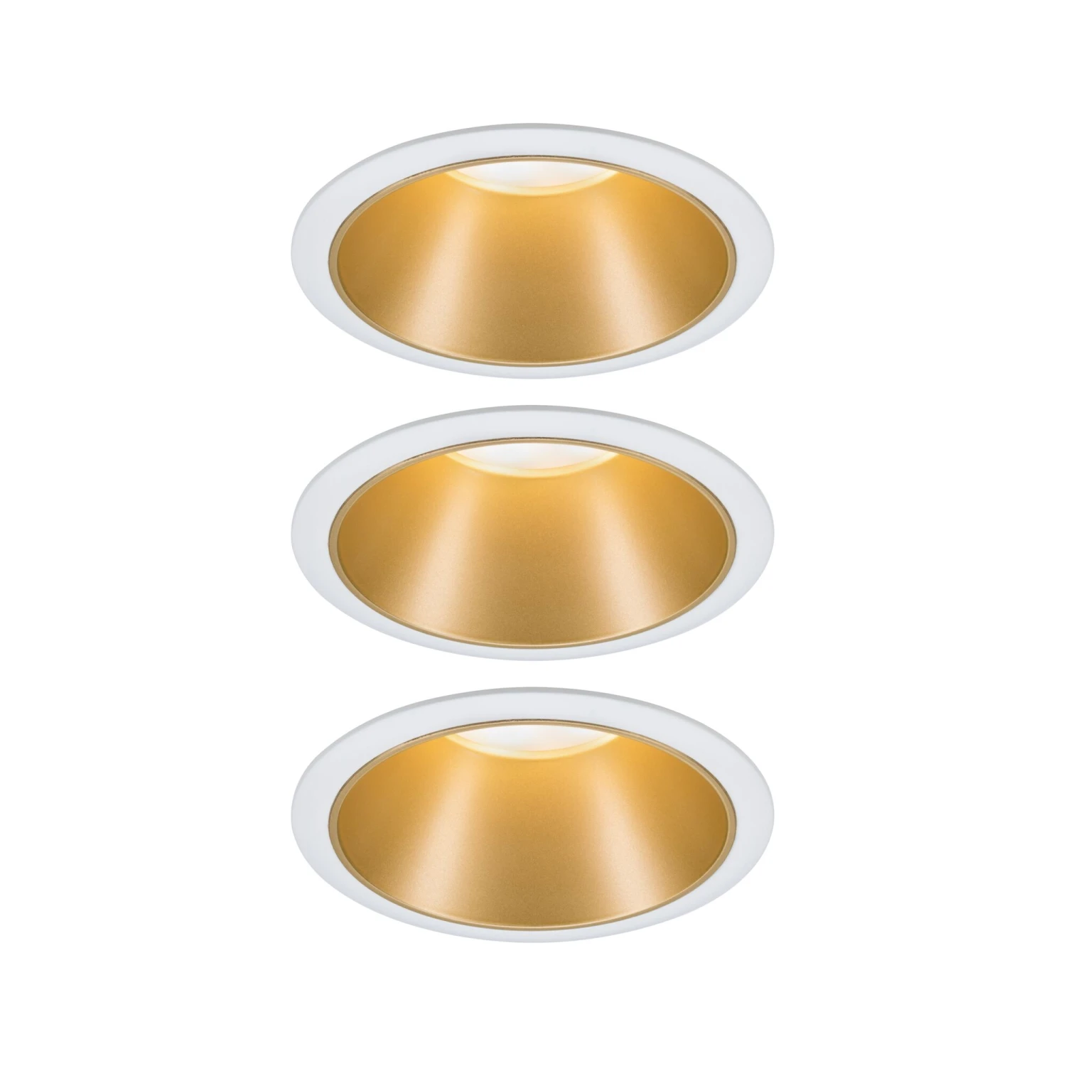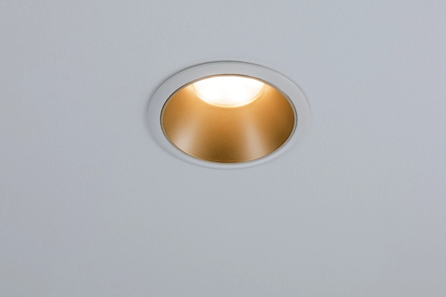 Liebe auf den zweiten Blick! Die Einbauleuchten Cole in Weiß/Gold verschmelzen durch die zurückgesetzten Leuchtmittel nahezu mit der Decke. Hat man sie aber entdeckt, möchte man gar nicht mehr wegschauen. Das Licht der zurückgesetzten Coins auf der matten, goldenen Oberfläche, sorgt für weiche und blendfreie Beleuchtung. Zusätzlich punkten sie mit brillanter Technik: Die wechselbaren LED Coins liefern angenehm warmweißes Licht und lassen sich mit einem herkömmlichen Lichtschalter in drei Stufen dimmen.