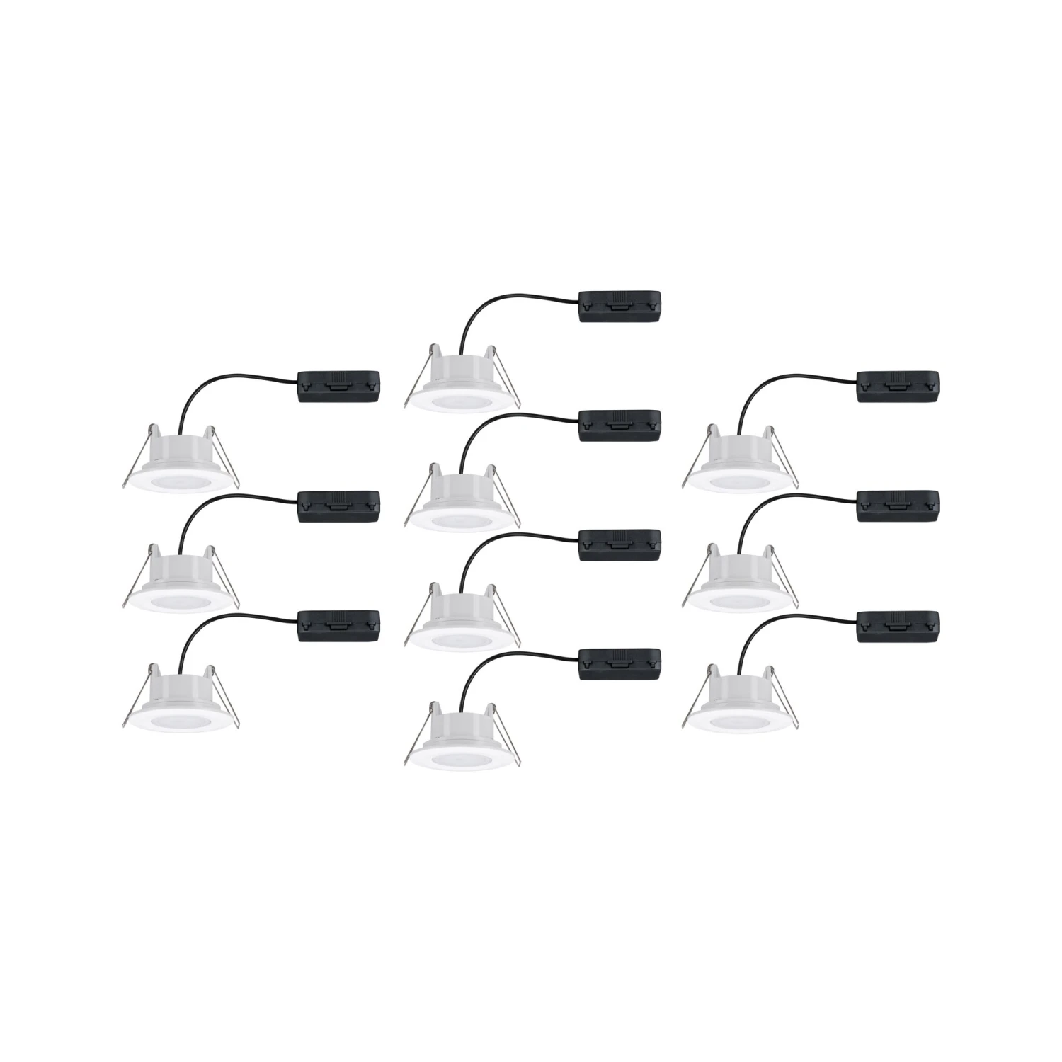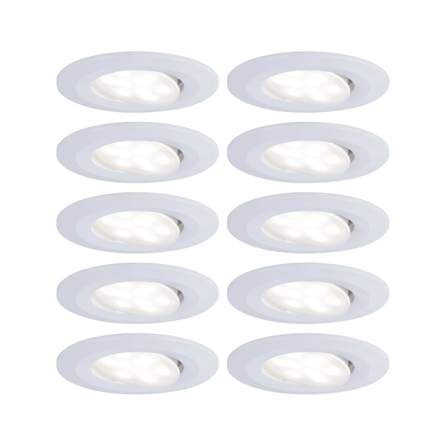 Sie sind kompakt, individuell und leuchtstark. Flexibel in ihren Möglichkeiten finden die LED Einbauleuchten Calla mit 10x6W in Weiß matt vor allem in Feuchträumen ihren Platz. Die blendfreien Einbaustrahler aus Kunststoff eignen sich sowohl für Neuinstallationen als auch für den Austausch bestehender Installationen. Durch den IP65 Strahlwasserschutz kann Feuchtigkeit ihr nichts anhaben. Durch die Schwenkbarkeit lässt sich das Licht überall dort hinlenken, wo es benötigt wird. Dank 230V-Direktanschluss, lassen sich die Leuchten ganz einfach uneingeschränkt miteinander verketten. Im Lieferumfang sind LED Leuchtmittel enthalten, die mit ihrem neutralweißen Licht für ein stimmungsvolles Ambiente sorgen.