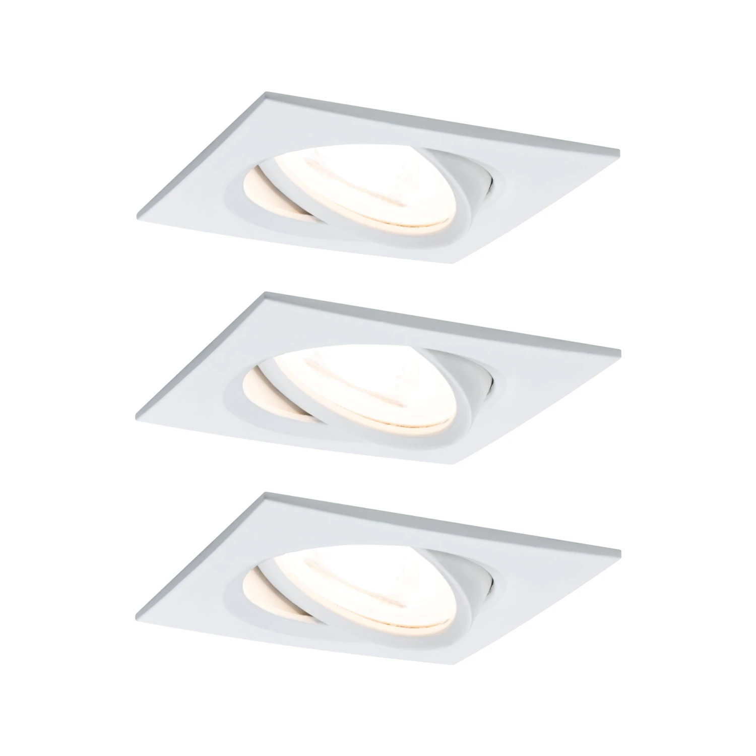 Die eckigen Nova Einbaustrahler in Weiß matt mit 3x6W und 3x470lm, bieten gutes Licht, stimmiges Design und hohe Energieeffizienz. Durch die Schwenkbarkeit lässt sich das Licht überall dort hinlenken, wo es benötigt wird. Die puristische Optik wird nicht von Sprengringen gestört: Da das Leuchtmittel von hinten eingesetzt wird ist kein Sprengring notwendig. Dank 230V-Direktanschluss, können die Leuchten ganz einfach uneingeschränkt miteinander verkettet werden. Durch die unkomplizierte Fixierung mit Haltefedern, bleibt die Zimmerdecke auch nach mehrmaligem Ein- und Ausbau unbeschädigt. Im Lieferumfang sind effiziente und langlebige Coin LED-Leuchtmittel enthalten, die mit ihrem warmweißen Licht für ein stimmungsvolles Ambiente sorgen.