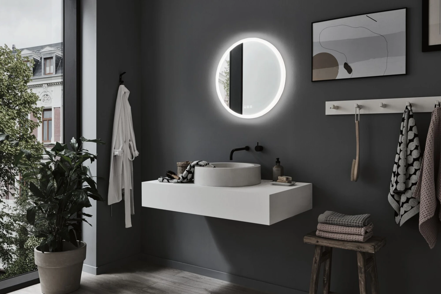 Der runde Leuchtspiegel Mirra ist durch Spritzwasserschutz für den Einsatz im Badezimmer oder Feuchtraum geeignet. Am Spiegel sind Touch-Schalter zum Ein- und Ausschalten, Einstellen der Lichtfarbe und Heizen vorhanden. Dank der WhiteSwitch-Funktion lässt sich die Lichtfarbe je nach Tageszeit und Bedürfnis einstellen: Tageslichtweiß – Wake up! Neutralweiß – Make up! Warmweiß – Relax! Die Heizfunktion sorgt auch bei Feuchtigkeit für klare Sicht.