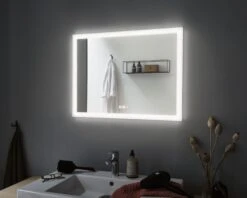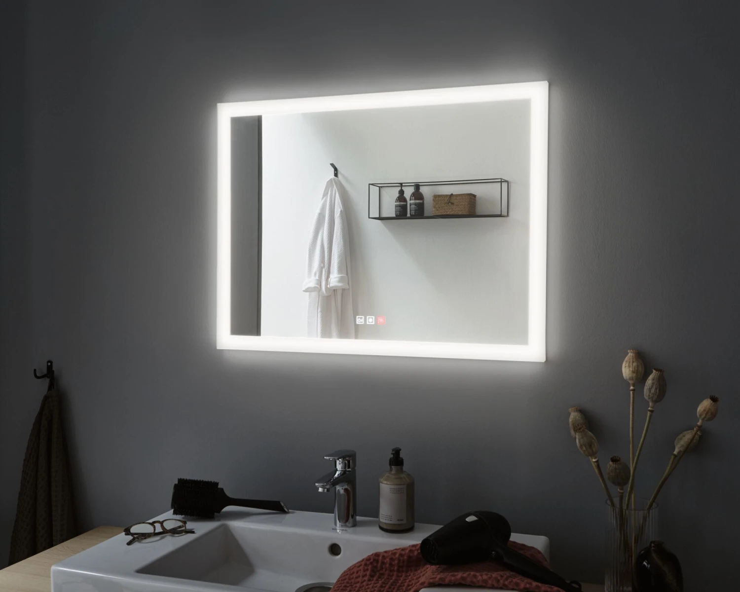 Wake up! Make-up! Relax! Drei Lichtfarben, drei Situationen über den Tag verteilt – synchron zum Sonnenverlauf. Beschlagene Spiegel gehören mit dem LED Spiegel Mirra der Vergangenheit an, denn die intrigierte Heizfunktion lässt den Spiegel nach dem Duschen wieder klar werden. Auf dem Spiegel sind drei verschiedene Bedienfelder mit Touchfunktionen eingearbeitet. Bei Berührung des Bedienfeldes On/Off wird das Licht am Rand des Spiegels an- und ausgeschaltet. Dank der WhiteSwitch-Funktion lässt sich die Lichtfarbe per Touch-Schalter auf dem Spiegel je nach Tageszeit und Bedürfnis einstellen: Tageslichtweiß – Wake up! Neutralweiß – Make up! Warmweiß – Relax! Über die Dimmfunktion lässt sich ganz individuell die Helligkeit anpassen. Durch den Spritzwasserschutz ist der Spiegel ideal für den Einsatz im Badezimmer oder Feuchtraum geeignet.