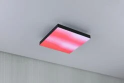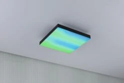 Spektakuläre Lichteffekte im Wohnraum – Das LED Panel Velora Rainbow in Schwarz in der Größe 295x295mm verbindet hervorragende Raumbeleuchtung mit purer Farbmagie, denn hier wurden beste Lichteigenschaften mit dynamischen Farbeffekten neu kombiniert. Die Farbtemperatur ist per Fernbedienung stufenlos von 3000 K warmweißem bis 6500 K tageslichtweißem Licht einstellbar und unterstützt den natürlichen Biorhythmus. Das LED Panel verblüfft zudem mit 16 voreingestellten Animationen und dynamischer Farbsteuerung, die so nur mit flächigem Licht möglich sind. Jede Licht-Szene kann in der Geschwindigkeit angepasst oder als Standbild eingefroren werden. So entsteht eine einzigartige und individuelle Leuchtenflächen. Das LED Panel Velora Rainbow ist stufenlos dimmbar und hat eine integrierte Nachtlichtfunktion. Die hochwertige mattierte Lichtfläche und das randlose, elegante Design zeichnen das Panel aus. Die Installation an Wand oder Decke erfolgt über einen Schweberahmen.