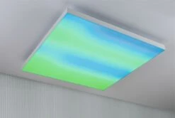Spektakuläre Lichteffekte im Wohnraum – Das LED Panel Velora Rainbow in Weiß in der Größe 595x595mm verbindet hervorragende Raumbeleuchtung mit purer Farbmagie, denn hier wurden beste Lichteigenschaften mit dynamischen Farbeffekten neu kombiniert. Die Farbtemperatur ist per Fernbedienung stufenlos von 3000 K warmweißem bis 6500 K tageslichtweißem Licht einstellbar und unterstützt den natürlichen Biorhythmus. Das LED Panel verblüfft zudem mit 16 voreingestellten Animationen und dynamischer Farbsteuerung, die so nur mit flächigem Licht möglich sind. Jede Licht-Szene kann in der Geschwindigkeit angepasst oder als Standbild eingefroren werden. So entsteht eine einzigartige und individuelle Leuchtenflächen. Das LED Panel Velora Rainbow ist stufenlos dimmbar und hat eine integrierte Nachtlichtfunktion. Die hochwertige mattierte Lichtfläche und das randlose, elegante Design zeichnen das Panel aus. Die Installation an Wand oder Decke erfolgt über einen Schweberahmen.