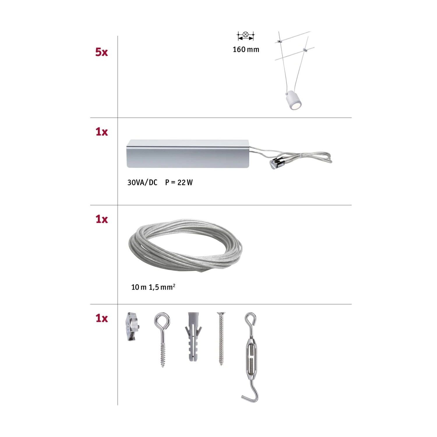 Das 5-flammige Seilsystem TunLED mit leistungsstarken, fest verbauten LED-Leuchtmitteln leuchtet Ihre Räume ideal aus. Es ist ausschließlich für die Deckenmontage geeignet.