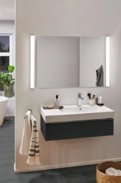 Die Wand- und Spiegelleuchte Tova mit einer Länge von 90 cm und einer Leistung von {Leistung_Naming} ist durch Spritzwasserschutz für den Einsatz im Badezimmer oder Feuchtraum geeignet. Dank der Tunable White Funktion lässt sich die Lichtfarbe per Fernbedienung je nach Tageszeit und Bedürfnis einstellen und dimmen: Tageslichtweiß – Wake up! Neutralweiß – Make up! Warmweiß – Relax!