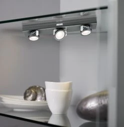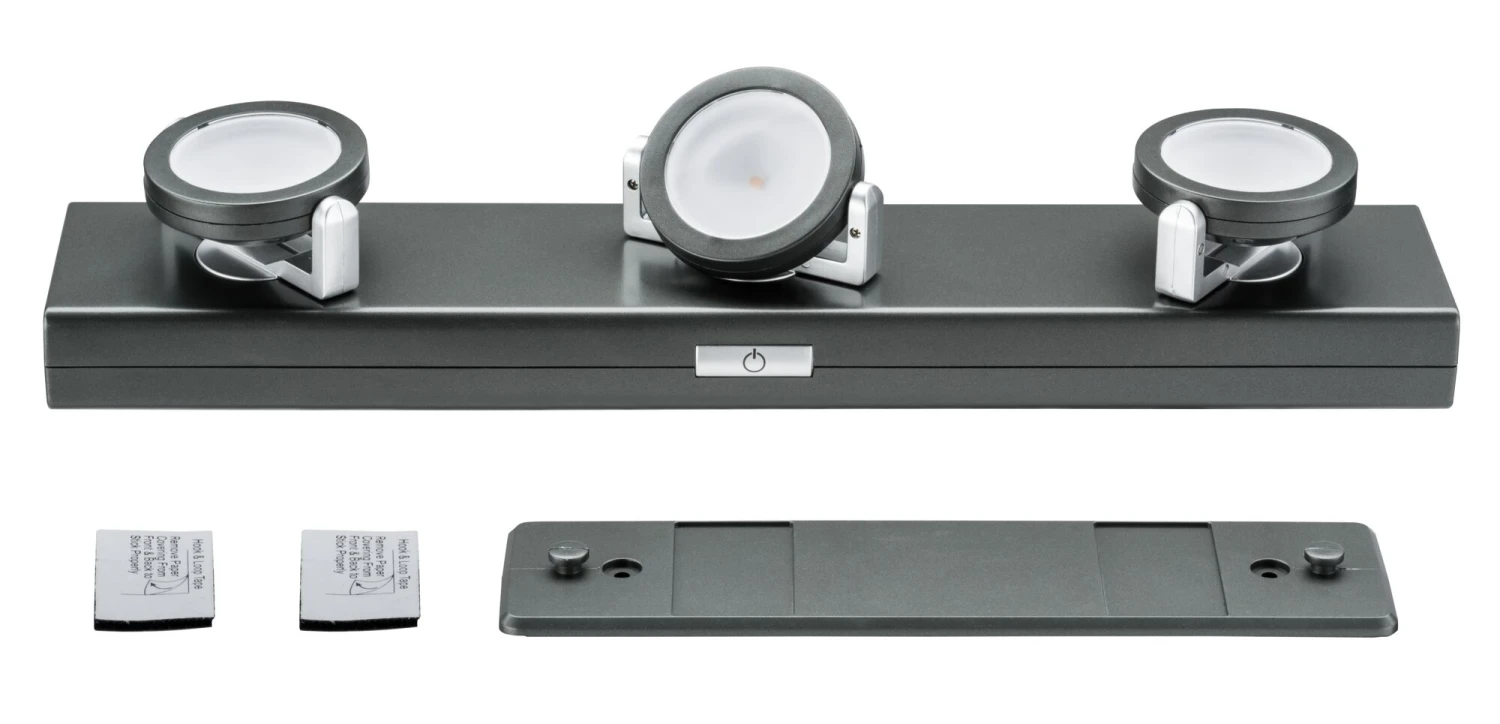 Die funktionale LED-Schrankleuchte Rotate leuchtet Arbeitsflächen, Schränke und Regale durch ihre schwenkbaren Spots optimal aus – egal ob in der Küche, im Büro oder in der Werkstatt. Die Leuchte wird auf eine Montageplatte geschoben, die mithilfe von zwei Schrauben oder ganz ohne Bohren mit Klettpads fixiert wird. So ist der Wechsel der sechs AAA-Batterien einfach und komfortabel möglich. Über einen Schalter kann das Licht ein- und ausgeschaltet sowie in zwei voreingestellten Helligkeitsstufen gedimmt werden.