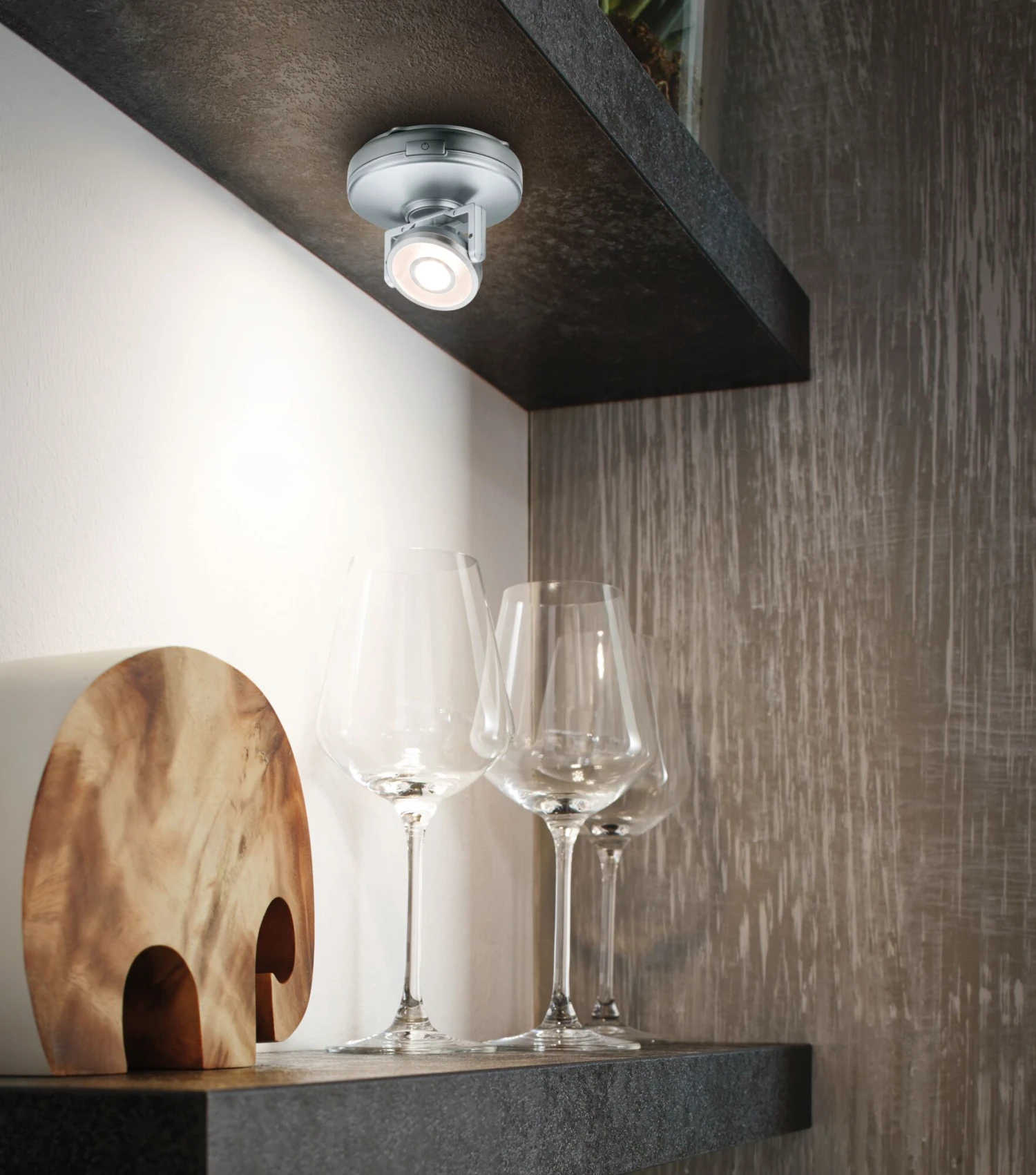 Die funktionale LED-Schrankleuchte Rotate leuchtet Arbeitsflächen, Schränke und Regale durch ihren schwenkbaren Spot optimal aus – egal ob in der Küche, im Büro oder in der Werkstatt. Die Leuchte wird auf eine Montageplatte geschoben, die mithilfe von zwei Schrauben oder ganz ohne Bohren mit Klettpads fixiert wird. So ist der Wechsel der drei AAA-Batterien einfach und komfortabel möglich. Über einen Schalter kann die Leuchte ein- und ausgeschaltet sowie stufenlos gedimmt werden.