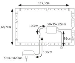 Spektakuläre Lichteffekte im Wohnraum, das MaxLED 250 TV-Comfort-Set RGBW mit Power Supply, LED-Stripes und Fernbedienung sorgt für eine indirekte Beleuchtung hinter dem Fernseher. Die komfortable Steuerung ermöglicht kinderleicht die direkte Farbwahl oder die Einstellung eines angenehmen gemütlichen Lichts durch die zusätzliche warmweiße LED. Praktisch: Durch die eigene Stromversorgung kann auch das Licht auch unabhängig vom TV eingeschaltet werden. Das Set ist mit seinen Stripe-Abschnitten und den 4 filigranen Ecken speziell auf einen 55 Zoll TV ausgelegt. Flexibel für jede Gehäuse-Form: Die extra lange Zuleitung und die Möglichkeit an allen 4 Ecken oder zwischen den einzelnen Stripes einzuspeisen, ermöglichen eine komfortable Verlegung am Rand der TV-Rückseite. Dank Kleberücken und Stecksystem ist die Montage sehr leicht und werkzeuglos durchzuführen.