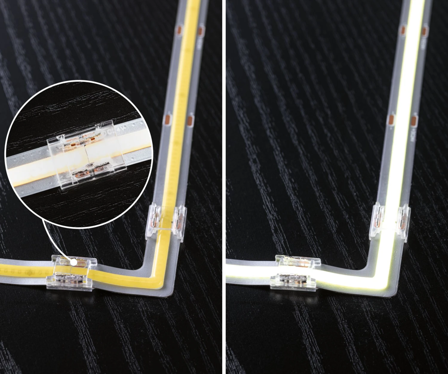Die MaxLED 500 Edge Full-Line COB Ecken sind die perfekte Ergänzung für ein MaxLED 500 Full-Line COB Lichtkonzept, welches über Eck verlegt werden soll. Mit den COB-Ecken für tageslichtweiße Strips können diese ohne Unterbrechung im Lichtbild um 90° verlegt werden. Jede Ecke wird inkl. zwei Lichtverbinder zum Anschluss ausgeliefert. Die Ecke kann universell in beide Richtungen links oder rechts angeschlossen werden. Ob Küchenarbeitsplatz, Werkstatt oder andere Arbeitsflächen, die MaxLED 500 Full-Line COB Strips sind so leistungsstark, dass sie problemlos zur Raumausleuchtung eingesetzt werden können.