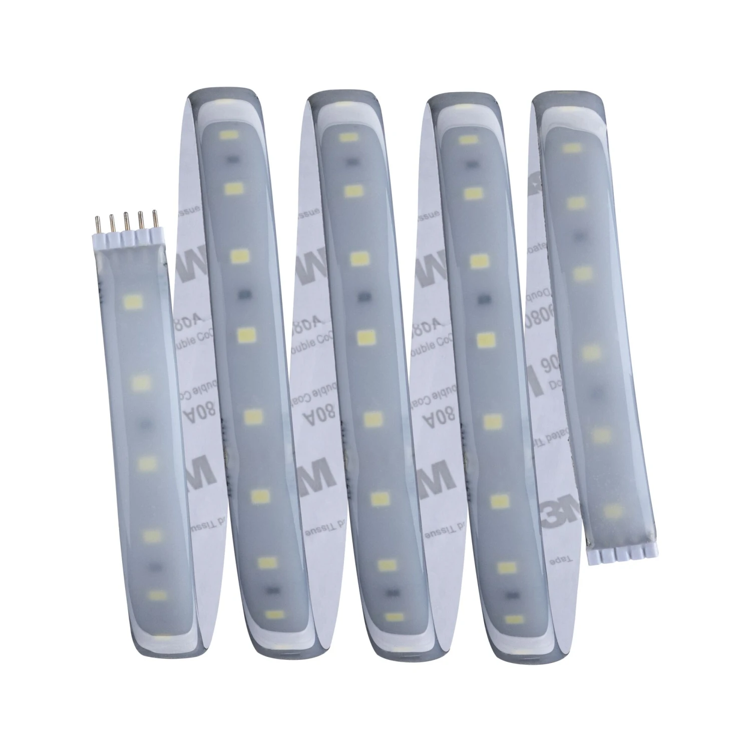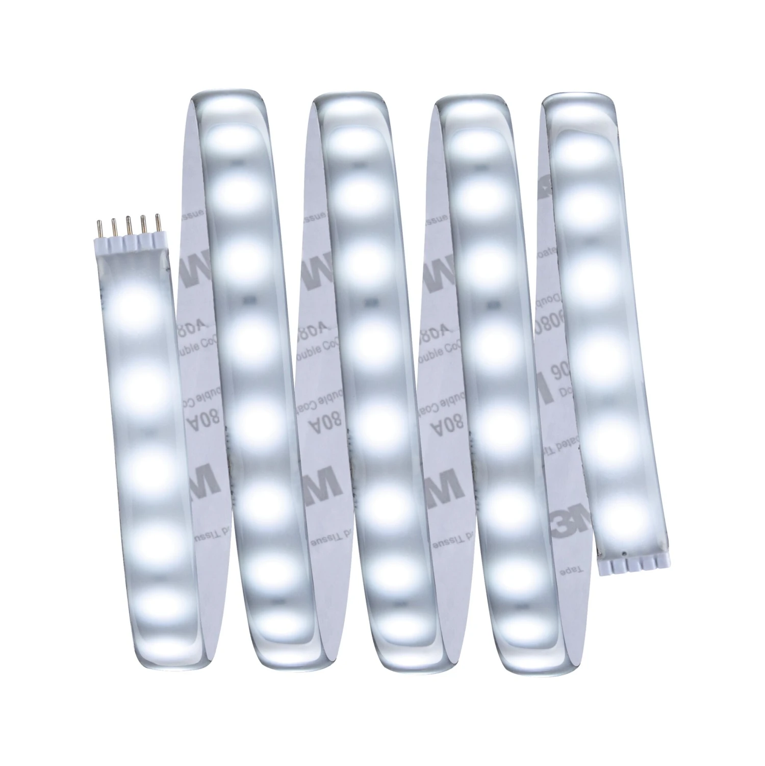 MaxLED-Strips 500 sind mit 9W und 440lm/m so leistungsstark, dass sie problemlos zur Raumausleuchtung eingesetzt werden können. Besonders in Profilen sind sie echte Highlights. Tageslichtweiße Strips sorgen für aktivierendes und konzentrationsförderndes Raum- und Nutzlicht. Das Basisset enthält neben dem Streifen mit einer Länge von 1,5m ein passendes Vorschaltgerät. Es lässt sich nach Bedarf mit zusätzlichen Strips, Verbindern und Steuerungseinheiten mit Fernbedienung erweitern. Bei der Planung darf die unten angegebene Maximallänge nicht überschritten werden. Mit IP44-Schutz ist der Strip speziell gegen das Eindringen von Spritzwasser und deshalb ideal für den Einsatz in Feuchträumen geeignet.