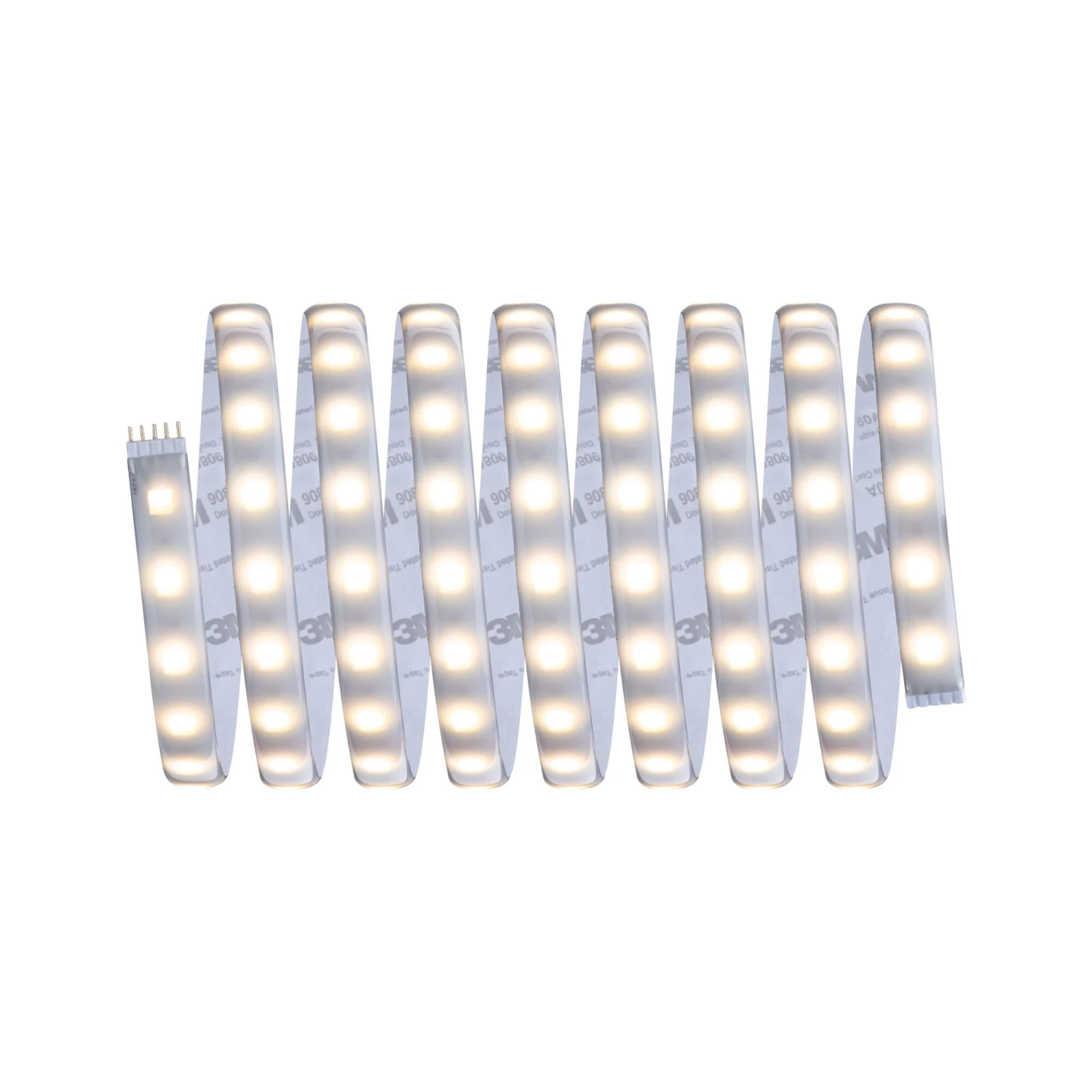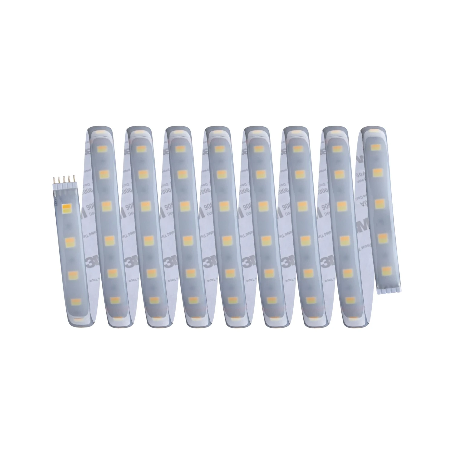 MaxLED-Strips 500 sind mit 20W und 470lm/m so leistungsstark, dass sie problemlos zur Raumausleuchtung eingesetzt werden können. Besonders in Profilen sind sie echte Highlights. Dank der intelligenten Weißlichtsteuerung Tunable White lässt sich die Lichtfarbe der Strips individuell variieren – von tageslichweißem Arbeitslicht bis hin zu warmweißer Entspannungsbeleuchtung ist alles möglich. Das Basisset enthält neben dem Streifen mit einer Länge von 3m ein passendes Vorschaltgerät und eine Steuerungseinheit mit Infrarotfernbedienung. Es lässt sich nach Bedarf mit zusätzlichen Strips und Verbindern erweitern. Bei der Planung darf die unten angegebene Maximallänge nicht überschritten werden. Mit IP44-Schutz ist der Strip speziell gegen das Eindringen von Spritzwasser und deshalb ideal für den Einsatz in Feuchträumen geeignet.