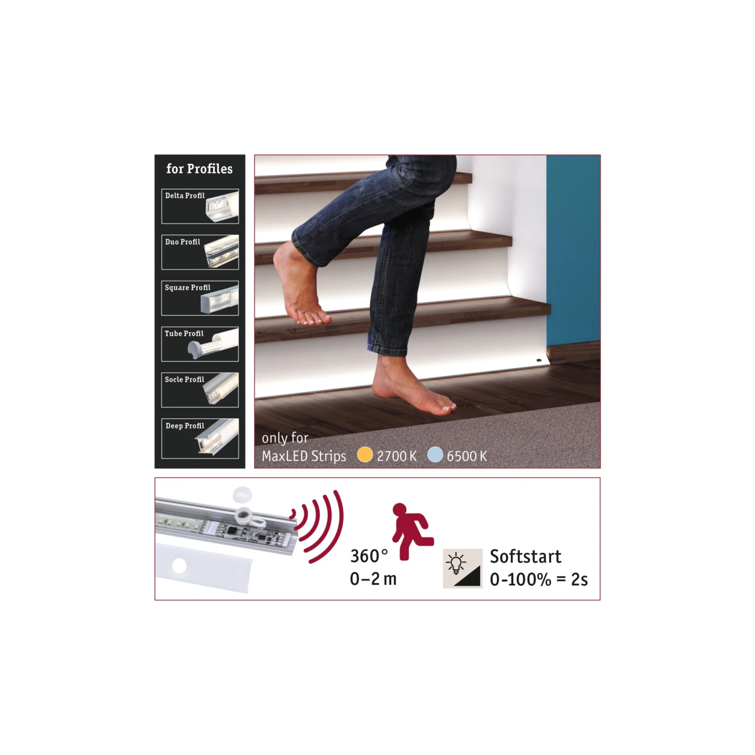 Der MaxLED Night Sensor steuert einfarbige LED Stripes. Er erfasst Bewegungen in Reichweite von bis zu 2m und schaltet das Licht bei Dämmerung und Dunkelheit ein. Der Bewegungssensor im Kleinstformat ist so breit wie ein LED Stripe und passt somit perfekt in Profile*. *Delta, Square, Tube, Duo, Socle & Deep.