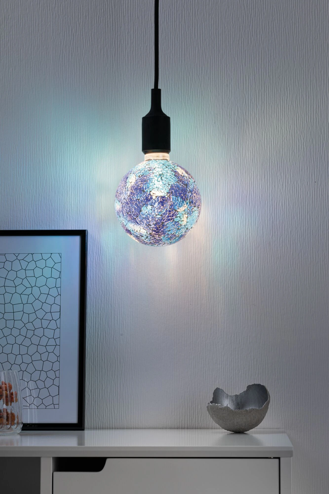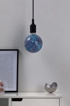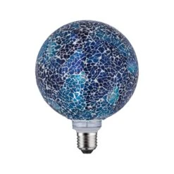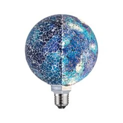 Die blaue Miracle-Mosaic-Globe mit einer Leistung von 5 Watt gibt ihr Licht in alle Richtungen ab. Der Innenkolben hat eine angenehm warmweiße Lichtfarbe und sie passt in jede handelsübliche E27-Fassung. Durch die Mosaik-Oberfläche sorgt sie für ganz besondere Licht-Effekte und ist sie auch im unbeleuchteten Zustand ein dekoratives Wohnaccessoire.