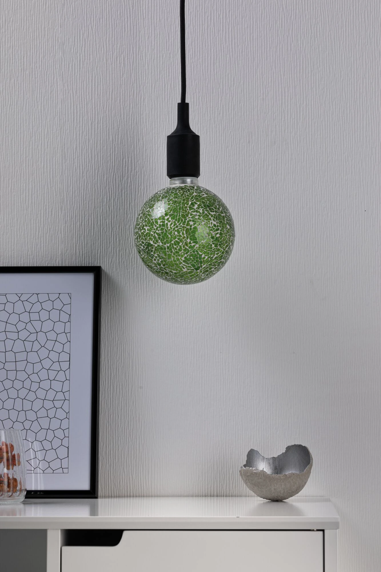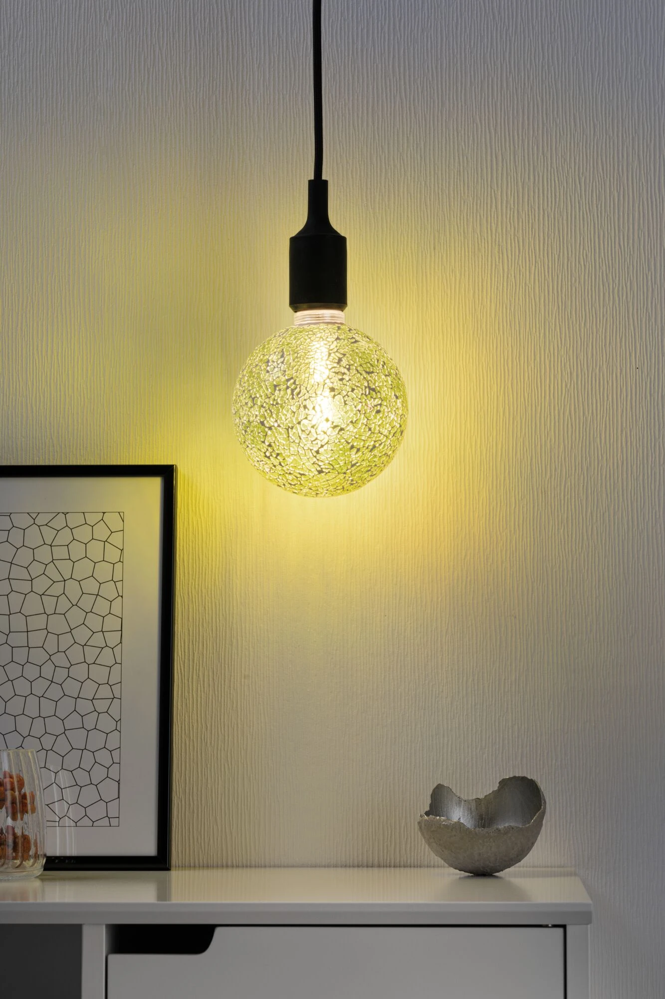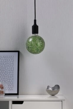 Die grüne Miracle-Mosaic-Globe mit einer Leistung von 5 Watt gibt ihr Licht in alle Richtungen ab. Der Innenkolben hat eine angenehm warmweiße Lichtfarbe und sie passt in jede handelsübliche E27-Fassung. Durch die Mosaik-Oberfläche sorgt sie für ganz besondere Licht-Effekte und ist sie auch im unbeleuchteten Zustand ein dekoratives Wohnaccessoire.