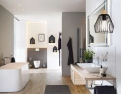 Holz gepaart mit zeitlosem Schwarz: die Cameo Pendelleuchte steht für wohnliches Licht im ganzen Haus. Dank IP44-Spritzwasserschutz eignet sie sich ideal für den Einsatz im Badezimmer oder über der Arbeitsfläche in der Küche.