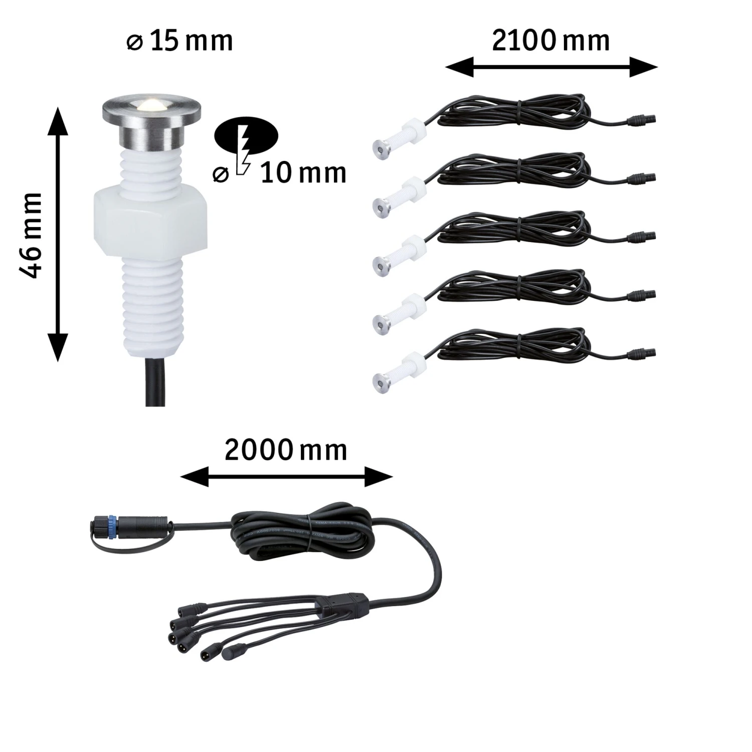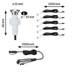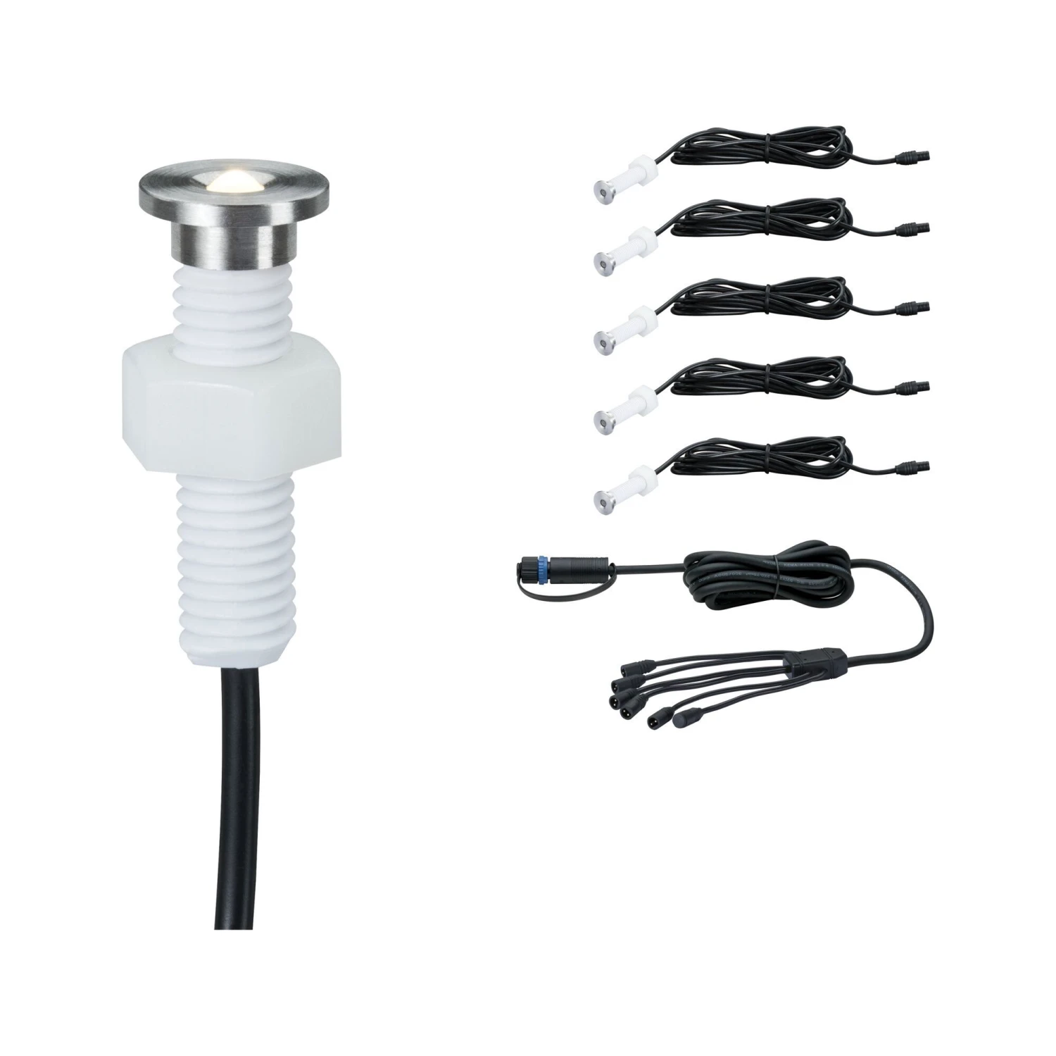 Plug & Shine MicroPen II Bodeneinbaustrahler sorgen für dekorative warmweiße Lichtpunkte an Wegen, in Einfahrten oder auf Terrassen. Mit diesem Ergänzungsset besteht die Möglichkeit bis zu fünf zusätzlichen Leuchten an bestehende 24V-Lichtinstallation anzuschließen. Ein Verbindungskabel mit sechs Anschlussbuchsen ist im Lieferumfang enthalten. Nicht benötigte Abgänge können mit den mitgelieferten Abdeckkappen verschlossen werden. Es ist nicht begeh- oder befahrbar.