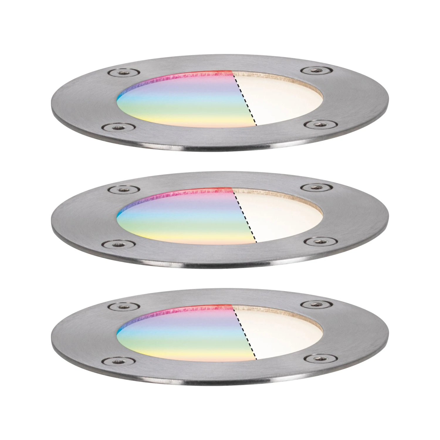 Die runden Smart Home Zigbee 3.0 Plug & Shine Bodeneinbaustrahler sorgen für tolle Lichtakzente und sind die perfekte Ergänzung des Gartenbeleuchtungssystems. Dieses Starterset enthält drei Leuchten, einen Steckertrafo und ein Verbindungskabel mit Anschlussbuchsen. Die fest verbauten LED Module liefern nach Wunsch buntes oder weißes Licht. Farbeinstellungen lassen sich ganz bequem via Zigbee 3.0 vornehmen. Dadurch werden weitere Steuerelemente wie die Plug & Shine Controller überflüssig.