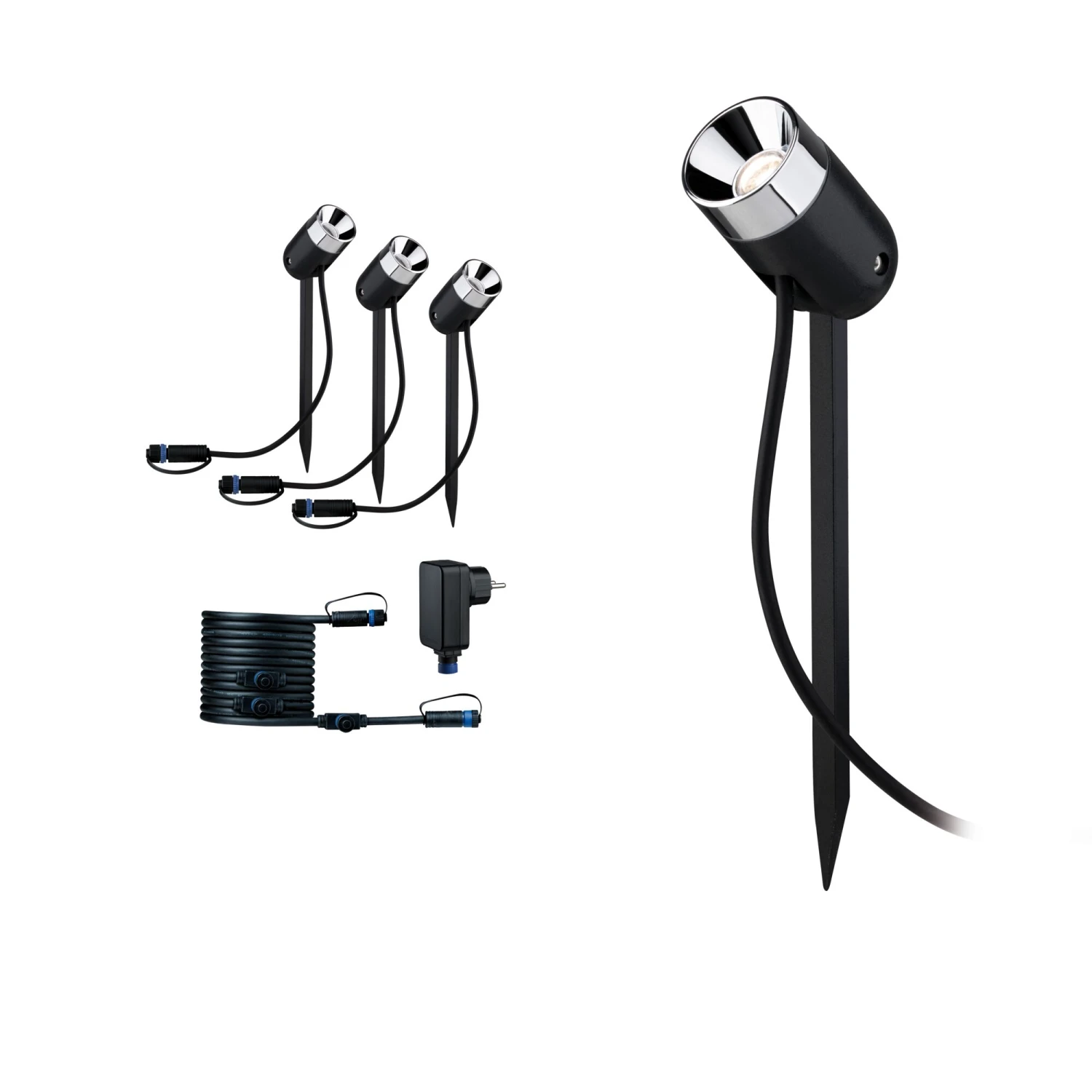 - Plug & Shine Basisset bestehend aus 3 Leuchten, 5 Meter Kabel mit 4 Ausgängen und Trafo