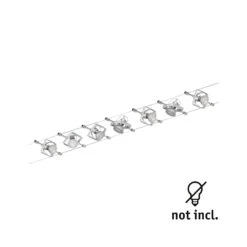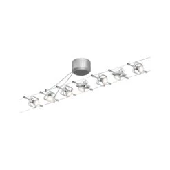 Egal ob gerade, schräg oder verwinkelt – Seilsysteme passen in jeden Raum. Das chrom matte Mac II Basisset mit 7 Spotköpfen kann sowohl an der Wand als auch an der Decke montiert werden und bietet dadurch grenzenlose Gestaltungsmöglichkeiten. Es lässt sich individuell durch Einzelspots, Umlenker und weiteres Zubehör ergänzen – dabei muss die maximale Trafoauslastung beachtet werden.