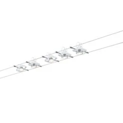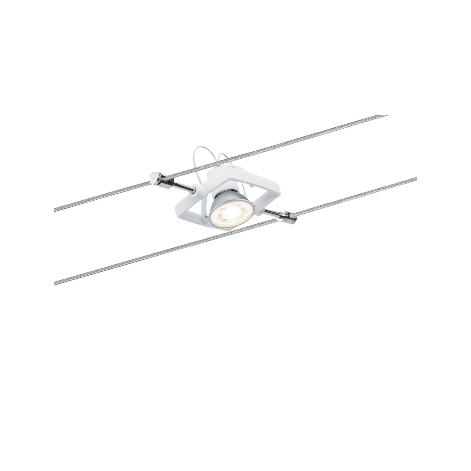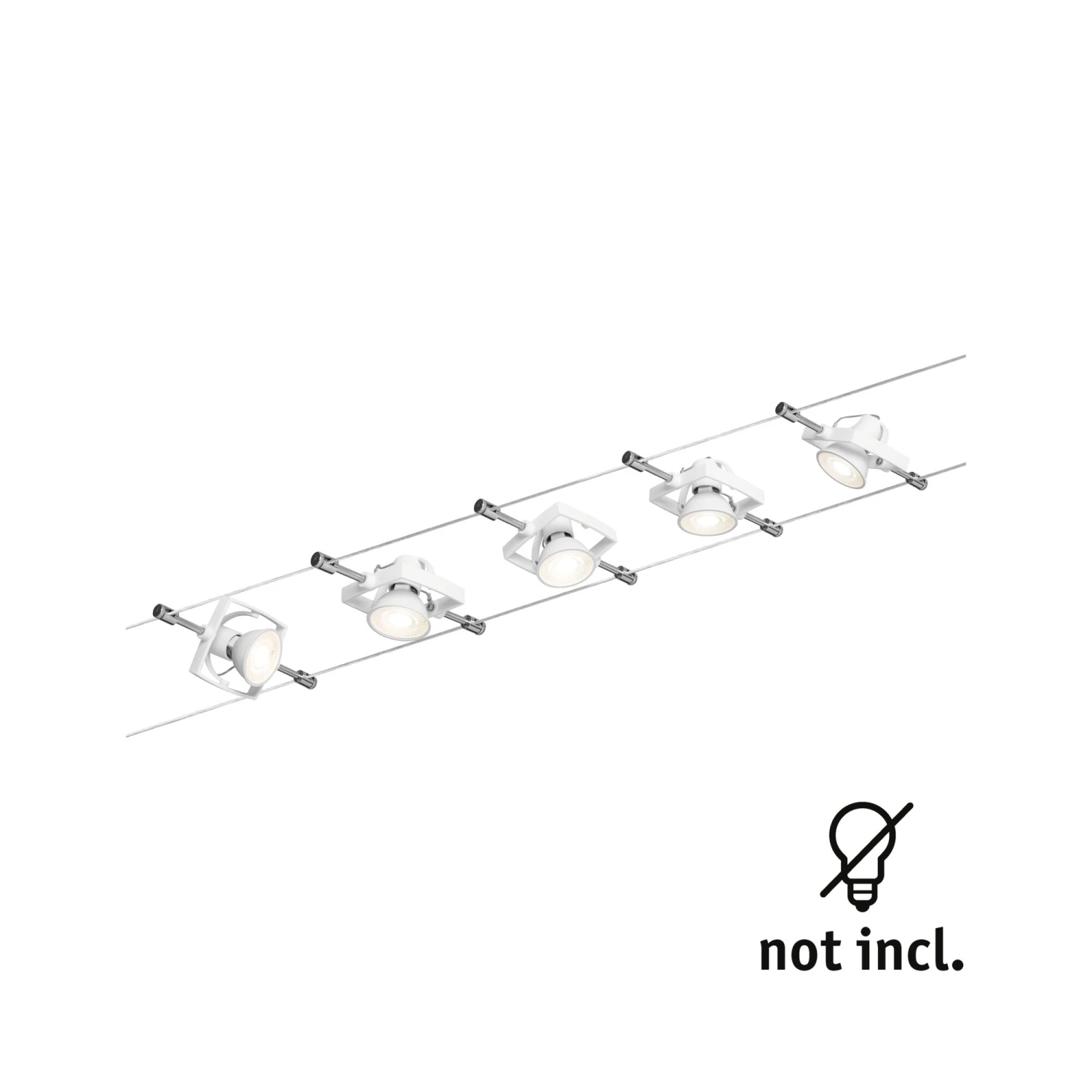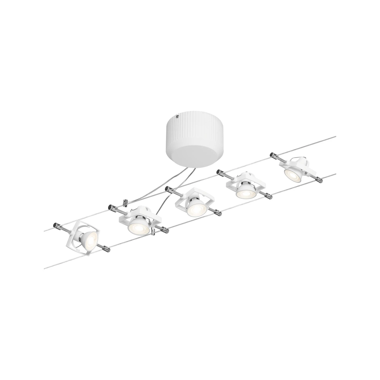 Egal ob gerade, schräg oder verwinkelt – Seilsysteme passen in jeden Raum. Das weiße TECH Basisset mit 5 Spotköpfen kann sowohl an der Wand als auch an der Decke montiert werden und bietet dadurch grenzenlose Gestaltungsmöglichkeiten. Es lässt sich individuell durch Einzelspots, Umlenker und weiteres Zubehör ergänzen – bitte beachten Sie dabei die maximale Trafoauslastung.