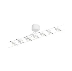Egal ob gerade, schräg oder verwinkelt – Seilsysteme passen in jeden Raum. Das weiße TECH Basisset mit 7 Spotköpfen kann sowohl an der Wand als auch an der Decke montiert werden und bietet dadurch grenzenlose Gestaltungsmöglichkeiten. Es lässt sich individuell durch Einzelspots, Umlenker und weiteres Zubehör ergänzen – bitte beachten Sie dabei die maximale Trafoauslastung.