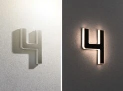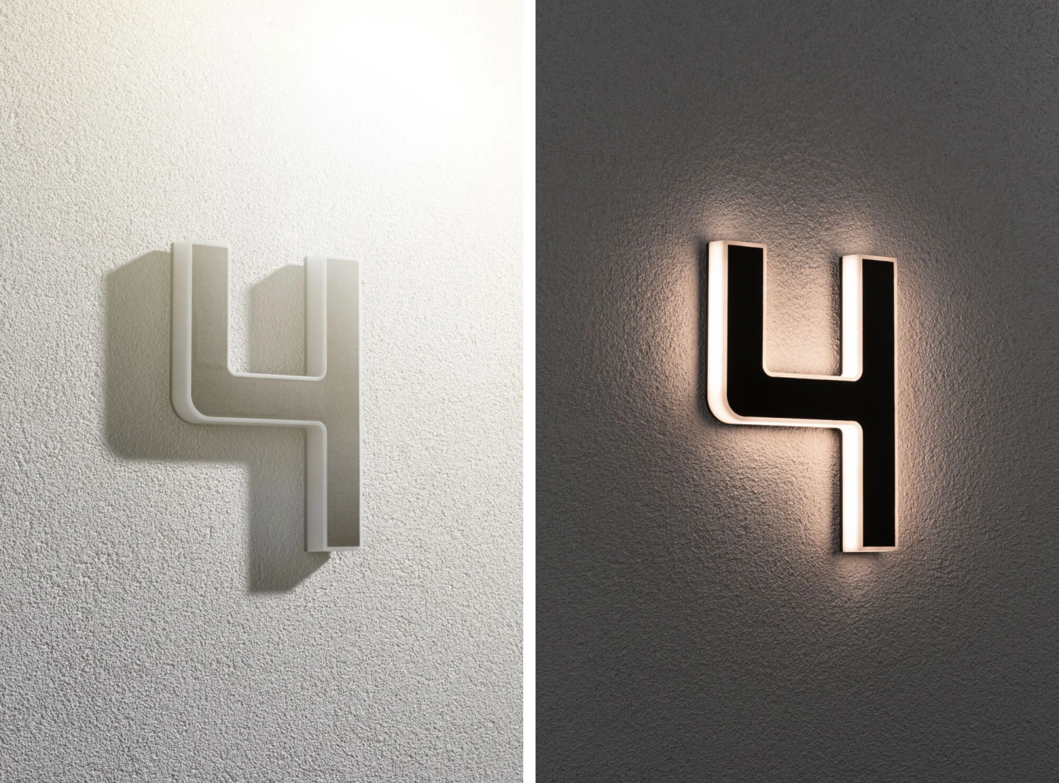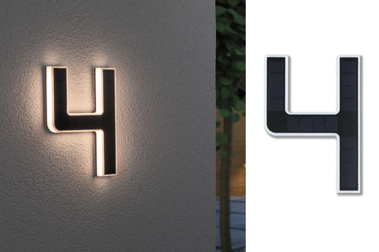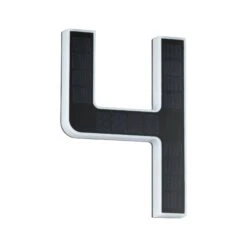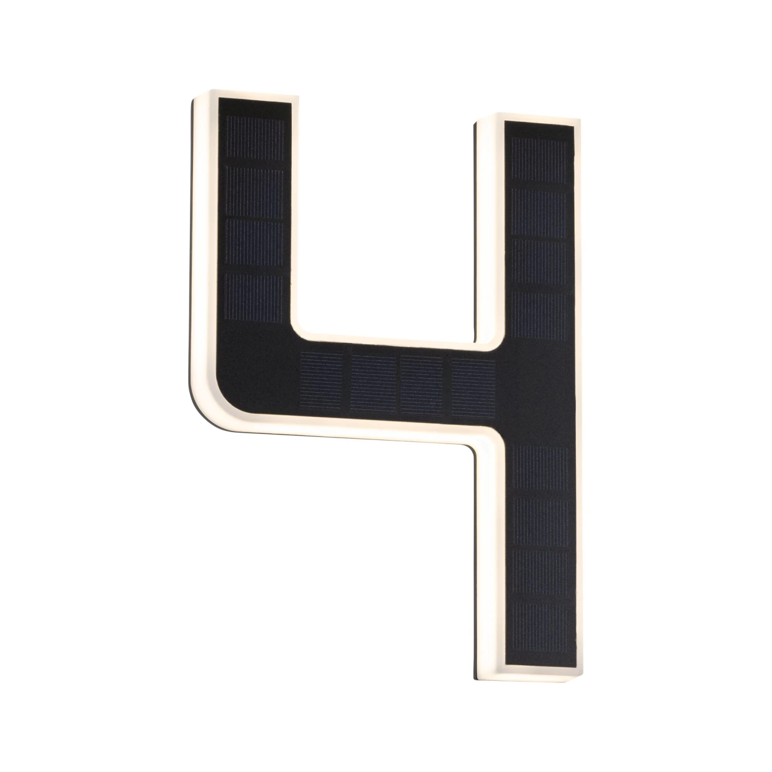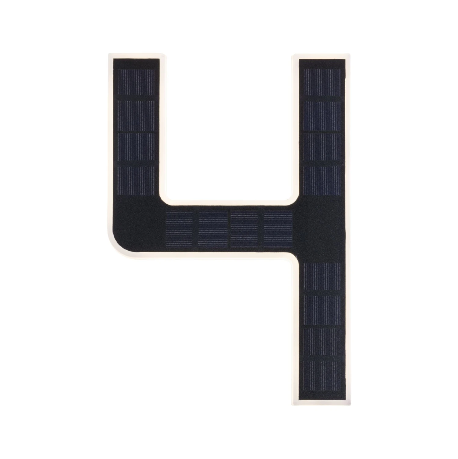 Die leuchtende Nummer 4 ist für sich allein oder mit weiteren Ziffern die perfekte Hausnummernleuchte. Dank Solarbetrieb kann sie ganz unabhängig von Stromauslass an der Hauswand befestigt werden. Tagsüber wird das unsichtbare Solarpanel vom Sonnenlicht aufgeladen, bei Nacht wird die dekorative Nummer indirekt beleuchtet.
