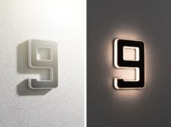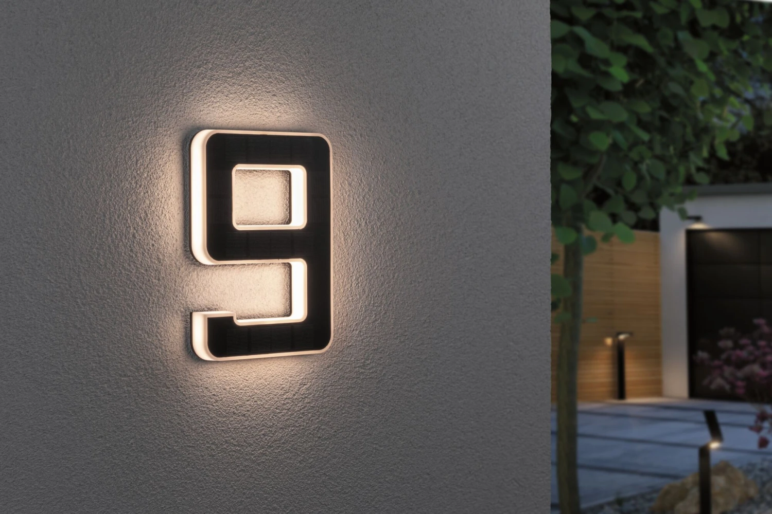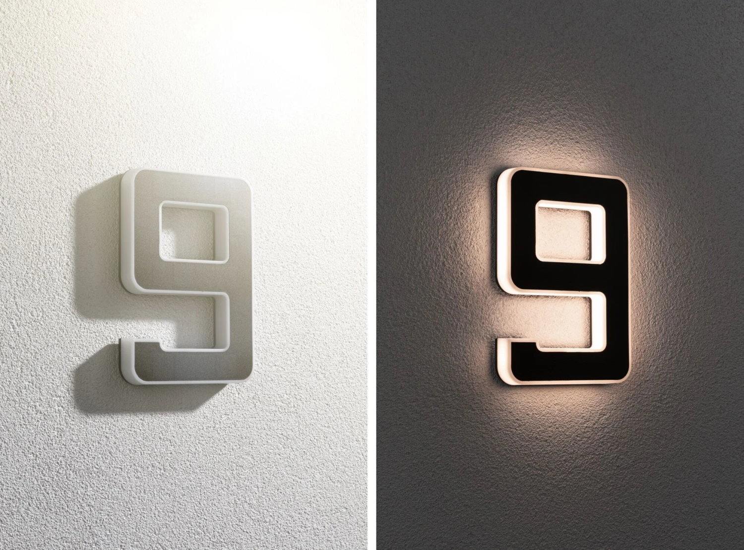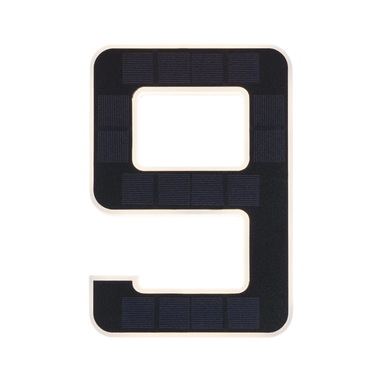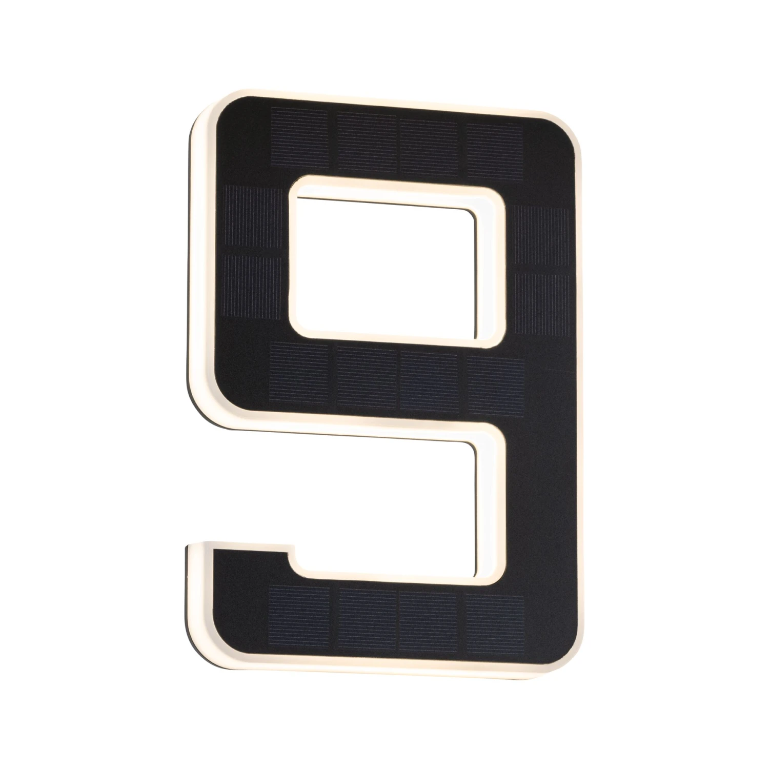 Die leuchtende Nummer 9 ist für sich allein oder mit weiteren Ziffern die perfekte Hausnummernleuchte. Dank Solarbetrieb kann sie ganz unabhängig von Stromauslass an der Hauswand befestigt werden. Tagsüber wird das unsichtbare Solarpanel vom Sonnenlicht aufgeladen, bei Nacht wird die dekorative Nummer indirekt beleuchtet.
