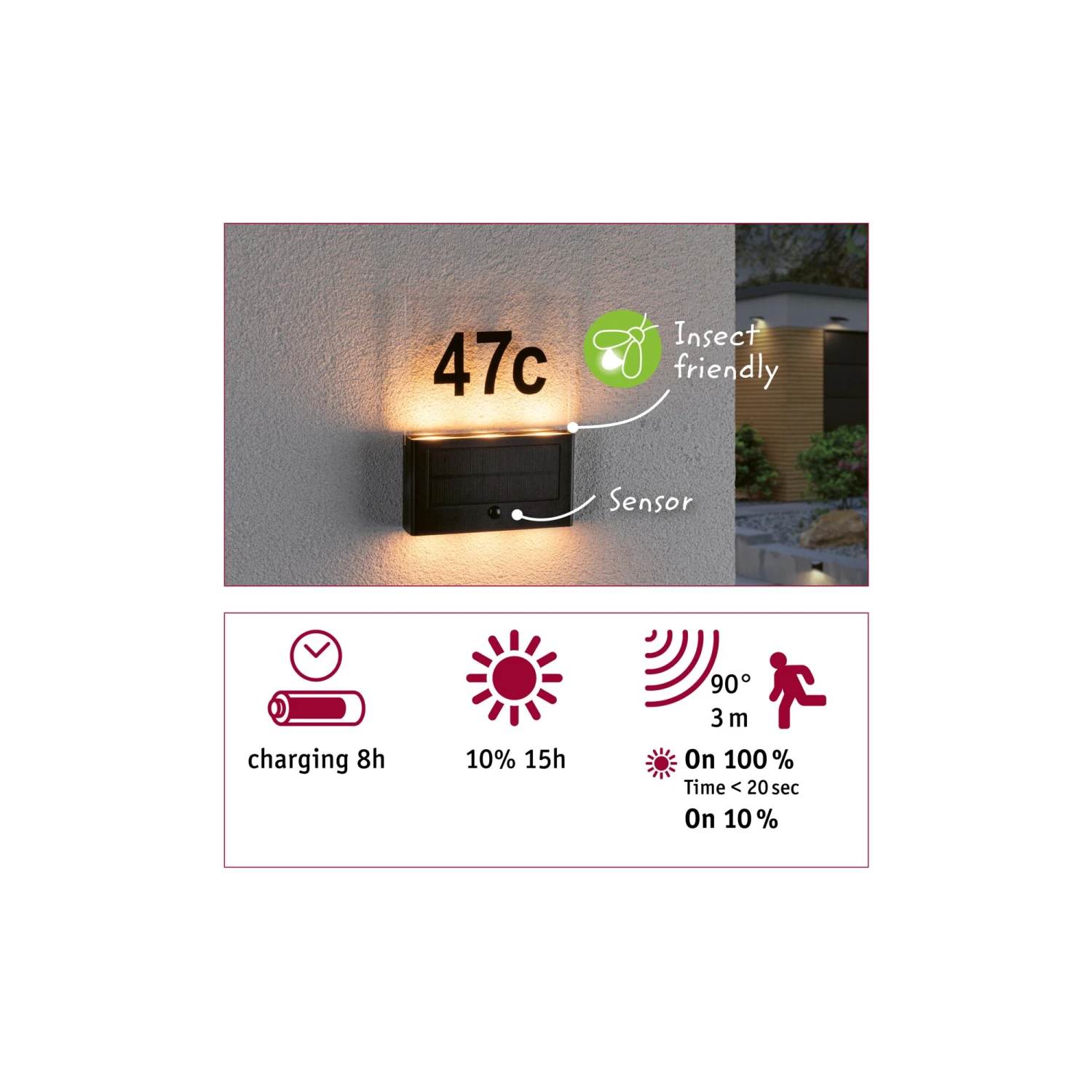 Die Solar Hausnummernleuchte Neda in der Größe 163x37mm mit 18lm eignet sich besonders gut für Außenwände, wo kein direkter Stromanschluss vorhanden ist. Leuchtende Hausnummern erleichtern im Dunklen den Gästen und Postboten das Suchen der richtigen Nummer. Die Solarleuchte lässt sich einfach frei platzieren. Durch die Sonneneinstrahlung lädt sich der Akku tagsüber auf und gibt dann die gespeicherte Energie durch Leuchten wieder ab. Das Licht wird durch den Dämmerungssensor automatisch eingeschaltet. Die Hausnummer wird mit 20 % der Lichtleistung nach Einbruch der Dämmerung betrieben. Sobald sich jemand nähert und Bewegung im Erfassungsbereich des Sensors wahrgenommen wird, schaltet die Leuchte für 15s auf 100%. Damit ist sie neben der Hausnummernbeleuchtung auch eine Wandleuchte. Die Solarleuchte ist mit einer Lichtfarbe von 2.200 K besonders insektenfreundlich, denn dieser Wert liegt außerhalb des sichtbaren Bereiches für Insekten, somit werden diese nicht von der zusätzlichen Lichtquelle angezogen. Sie schützt die Insekten aktiv, ohne dabei den Nutzen für den Menschen zu vernachlässigen. Das warme Goldlicht schafft eine angenehme Stimmung rund ums Haus.
