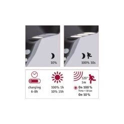 - Ladezeit bei Sonnenausrichtung 6 – 8 Stunden, Leuchtdauer 8 – 10 Std.