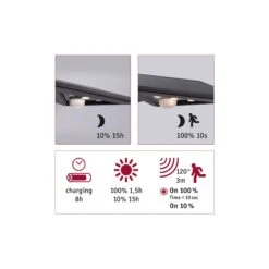 - Ladezeit bei Sonnenausrichtung 6 – 8 Stunden, Leuchtdauer 8 – 10 Std.