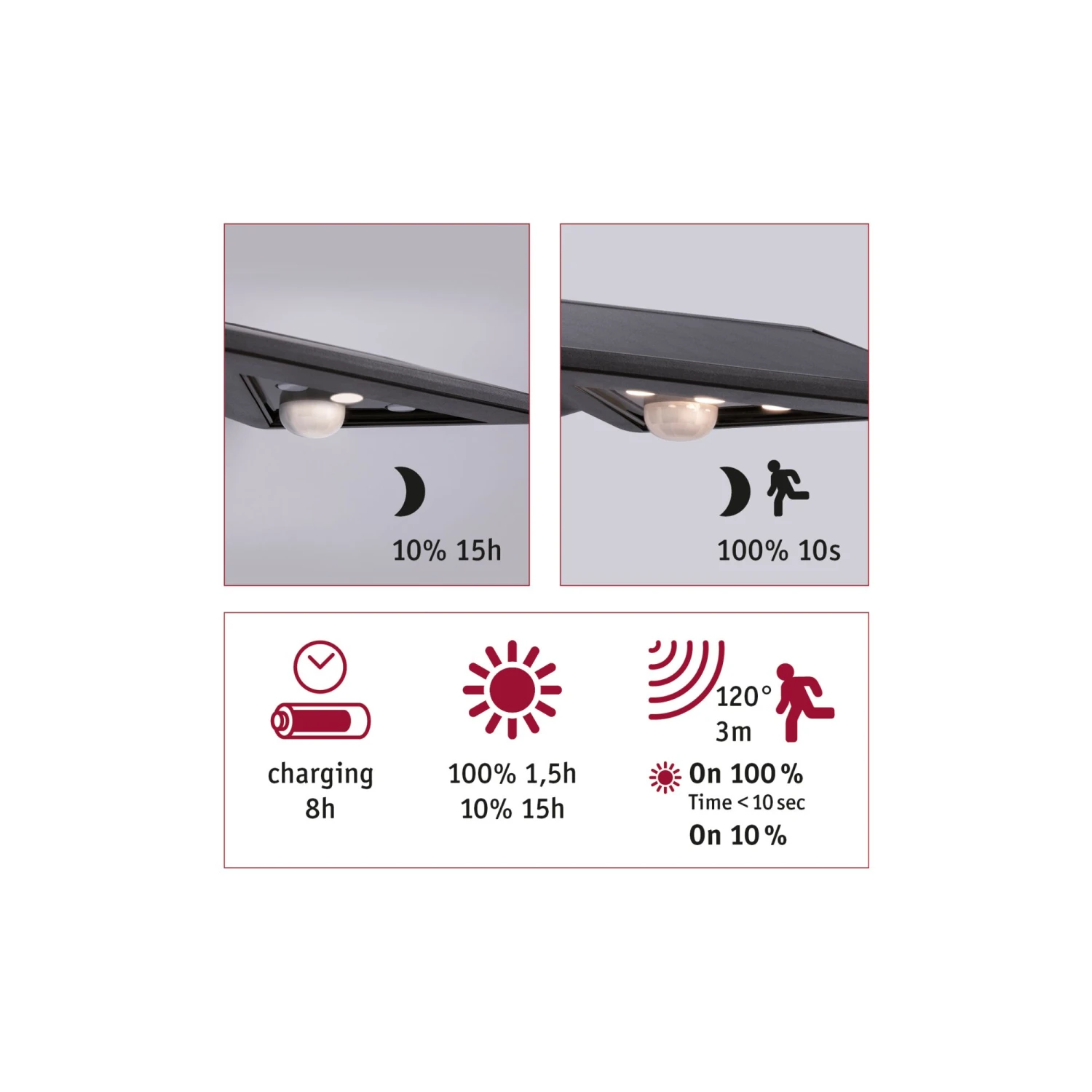 Die Solarleuchte Yoko in Anthrazit mit ${Nennlichtstorm_Naming} bringt Licht an jede Außenwand. Dank praktischer Solartechnik, ist ein Stromanschluss für die Montage nicht notwendig. Tagsüber wird der Akku durch Sonnenlicht aufgeladen und in der Dämmerung leuchtet ein kleines Orientierungslicht, das von einem Funktionslicht abgelöst wird, sobald sich jemand nähert.