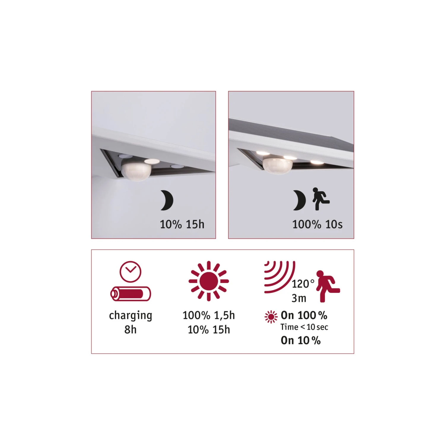 - Ladezeit bei Sonnenausrichtung 6 – 8 Stunden, Leuchtdauer 8 – 10 Std.
