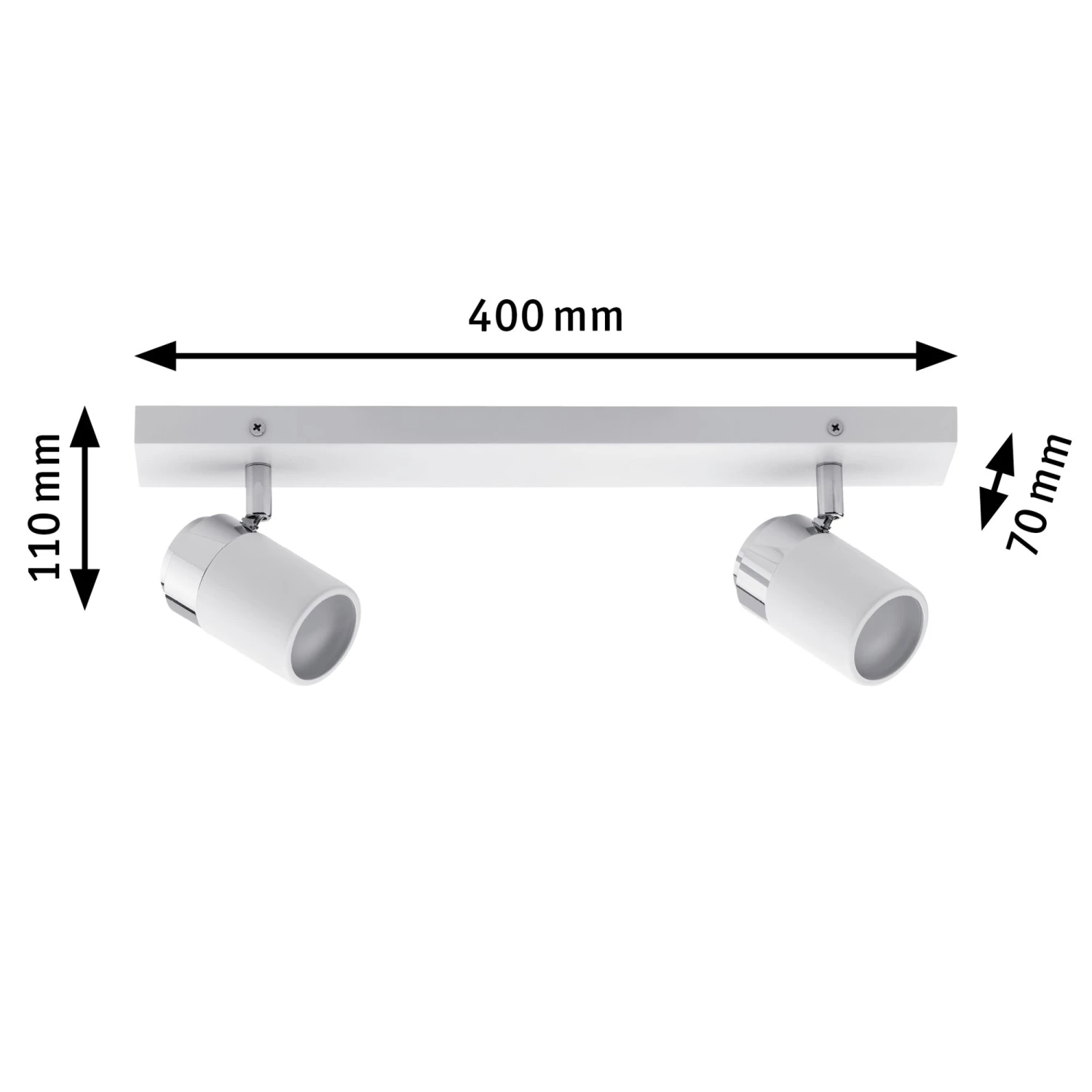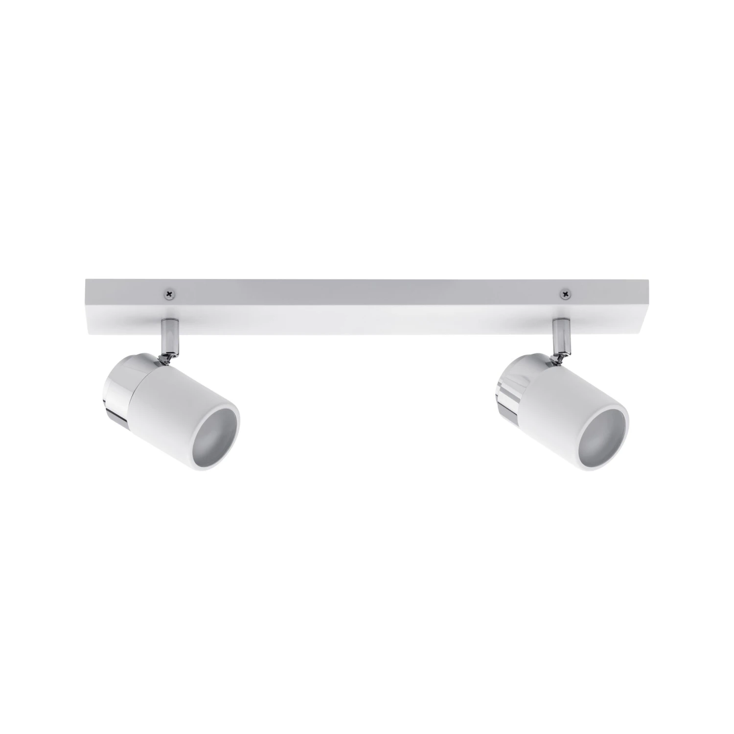 Das zweiflammige Spotlight der Serie Zyli in Weiß/Chrom eröffnet vielfältige Einsatzmöglichkeiten und fügt sich mit seinem schlichten Design nahtlos in jede Wohnsituation ein. Durch den Spritzwasserschutz ist selbst die Montage in Feuchträumen kein Problem. Das Leuchtmittel ist frei wählbar. Es lassen sich beliebige Reflektorlampen mit GU10-Sockel und einer Leistung von max. 2x10W einsetzen.