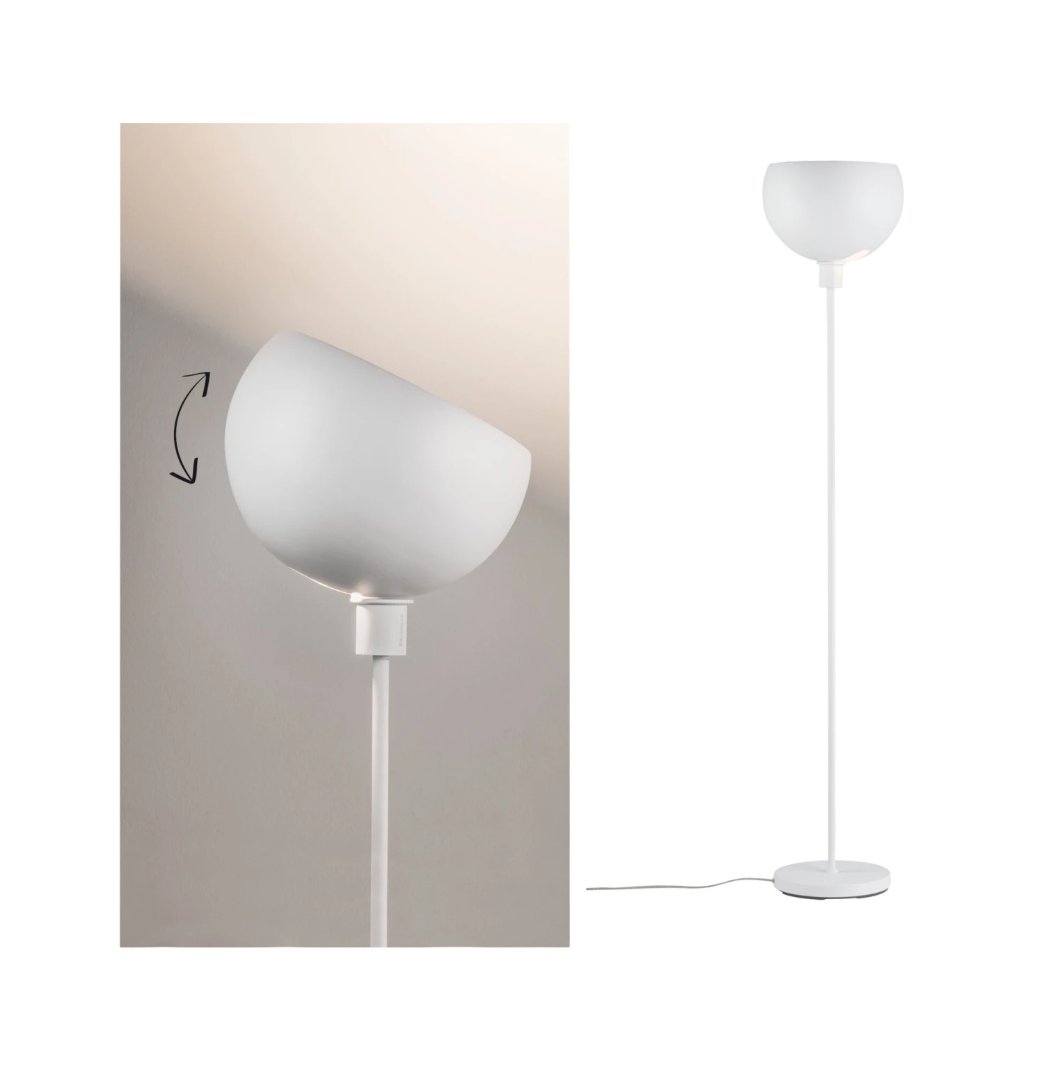 Der Metallschirm der Stehleuchte Gambia lässt sich nach Bedarf ausrichten: einfach Schraube lösen, gewünschte Neigung einstellen und wieder fixieren. So werden indirekte Lichtakzente an Decken und Wänden gesetzt. Die Leuchte kann mit einem E27-Leuchtmittel bestücken werden.